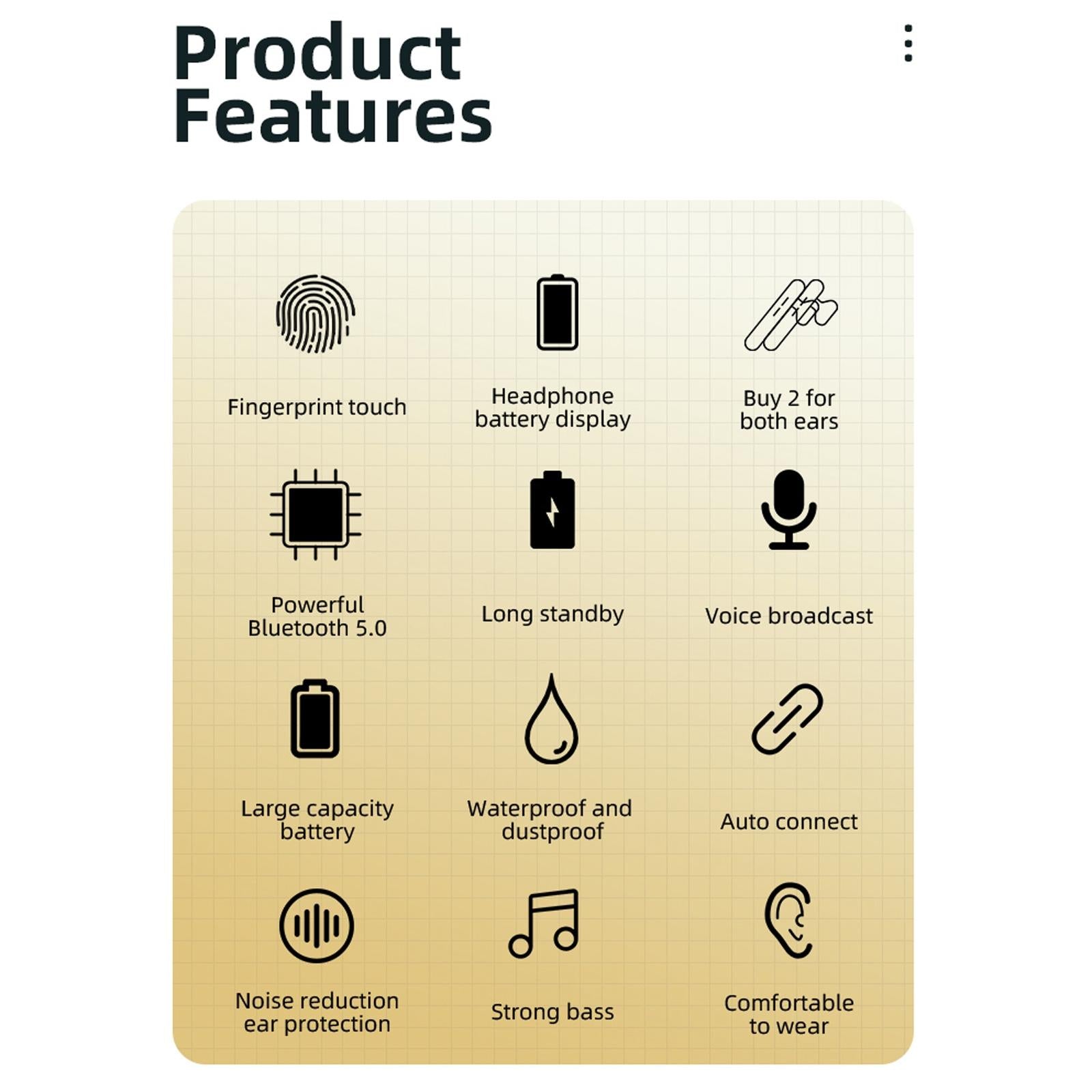 This Bluetooth 5.0 earphone features an ergonomic design for comfortable wear and offers intelligent noise reduction for clear, high-definition calls. It is equipped with a fingerprint touch control for easy operation and has an IPX3 waterproof rating to resist rain and sweat. One-click access to a voice assistant enhances user convenience, making it suitable for daily use and active lifestyles.