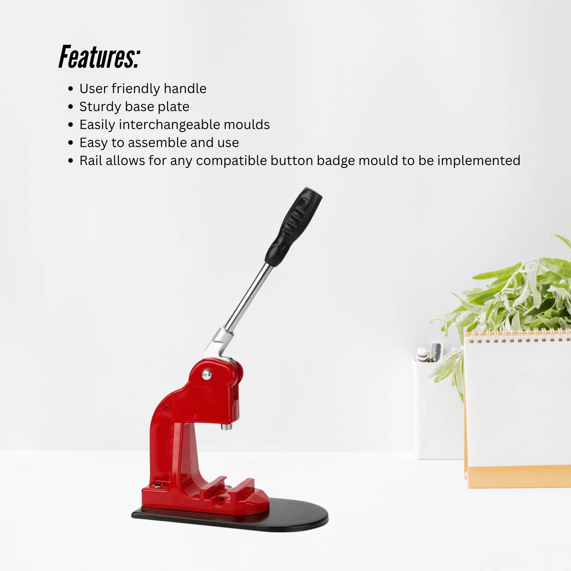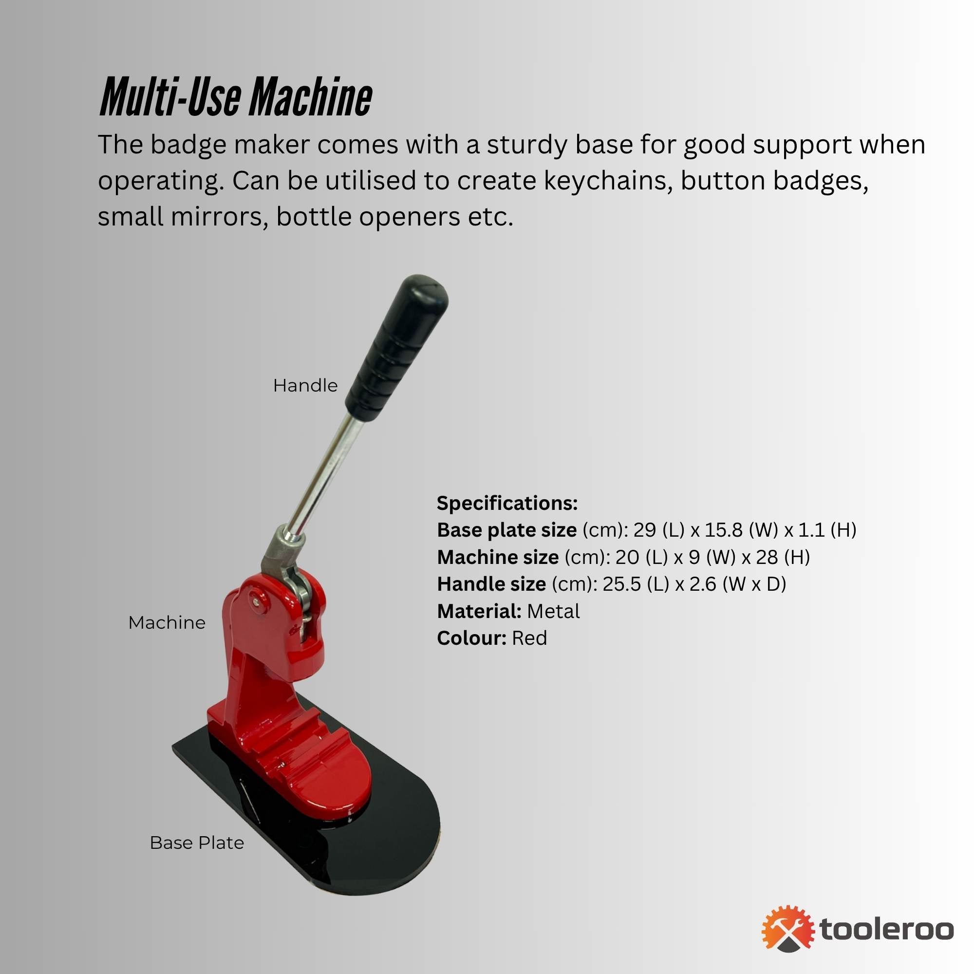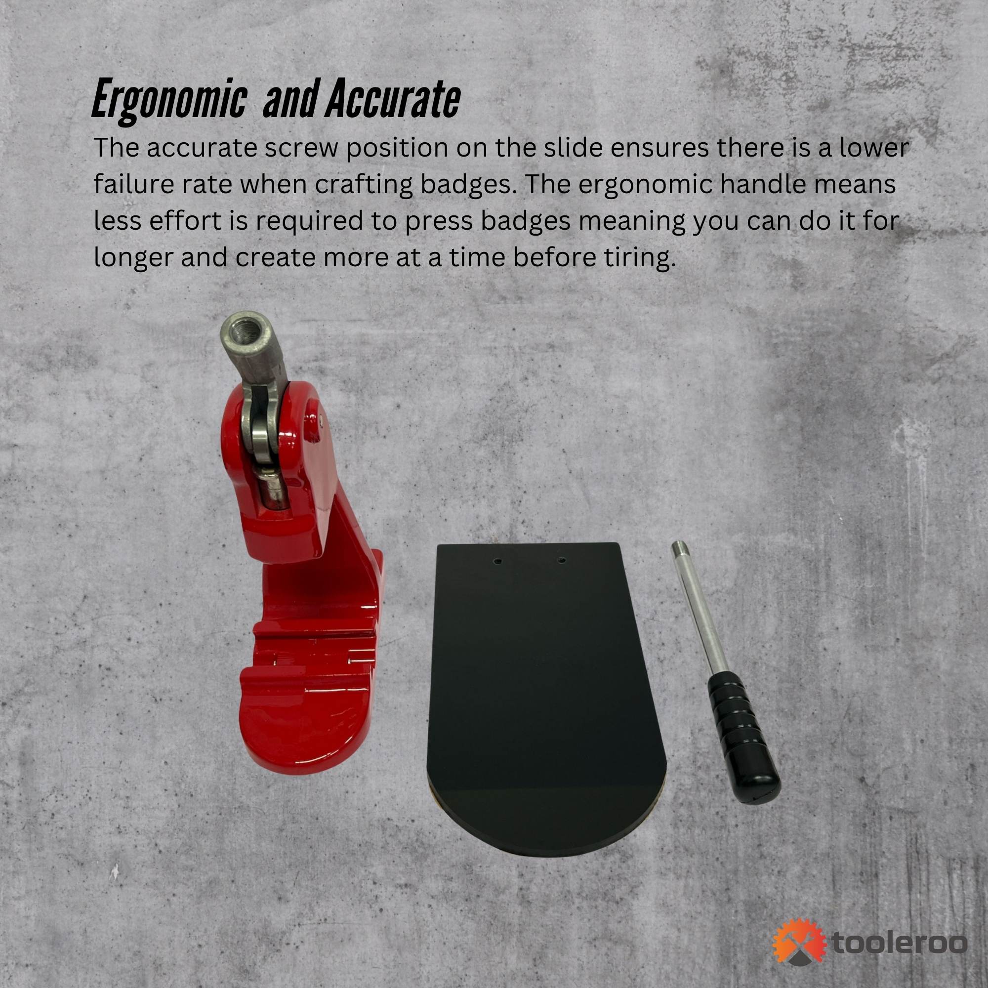 This badge maker is designed for ease of use and efficiency. It features an accurate screw positioning on the slide to reduce the failure rate during badge crafting. The ergonomic handle requires less effort, allowing for longer use and higher productivity. The slide rail enables quick and easy interchangeability of standard molds, supporting a fast two-step badge making process that can produce approximately 200-300 badges per hour with an experienced operator. The sturdy base provides stable support during operation and allows for the creation of various items such as keychains, button badges, small mirrors, and bottle openers.