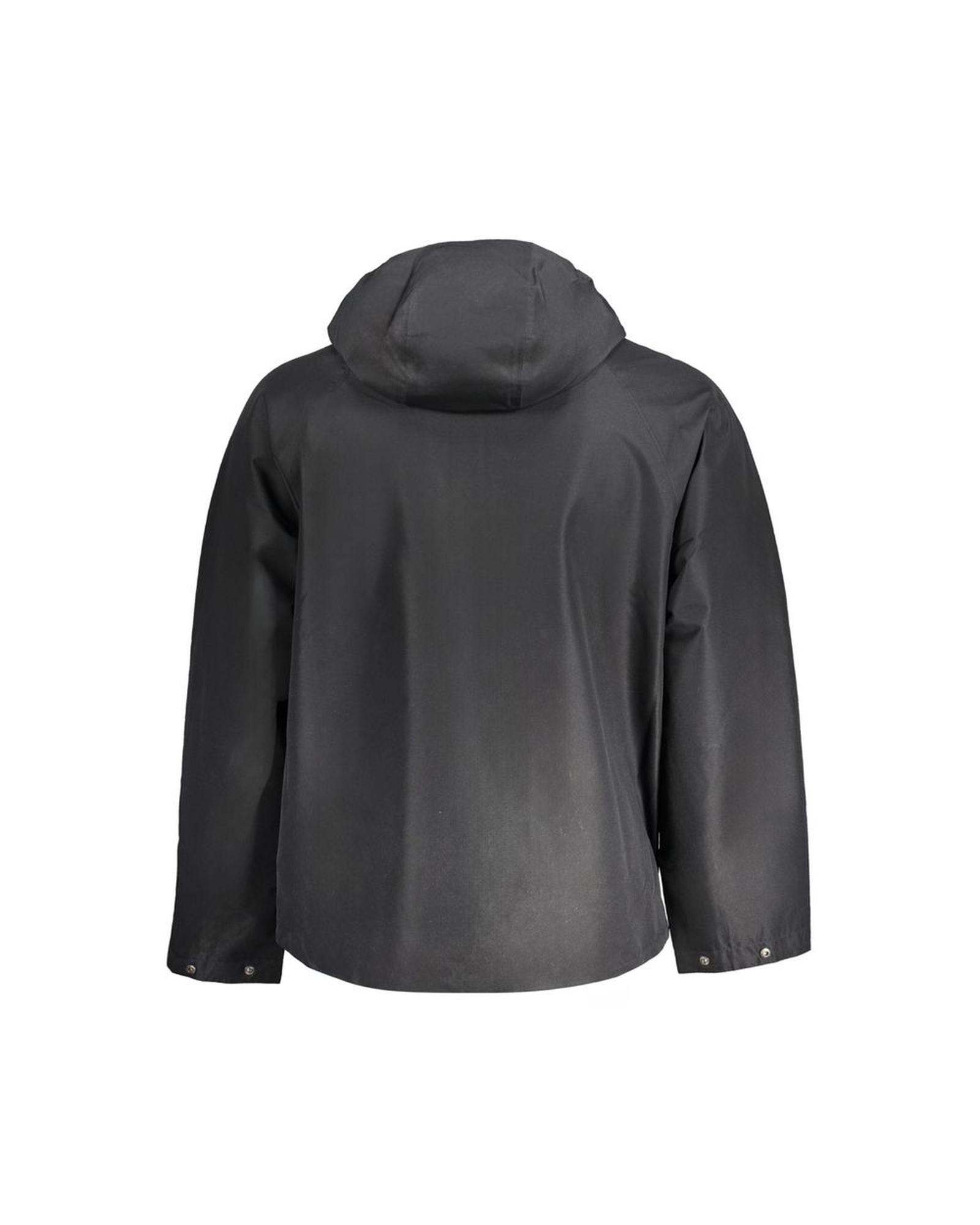 This men’s black polyester jacket is designed for a sporty and stylish look. It features a hooded design with practical details suitable for everyday wear and outdoor activities.