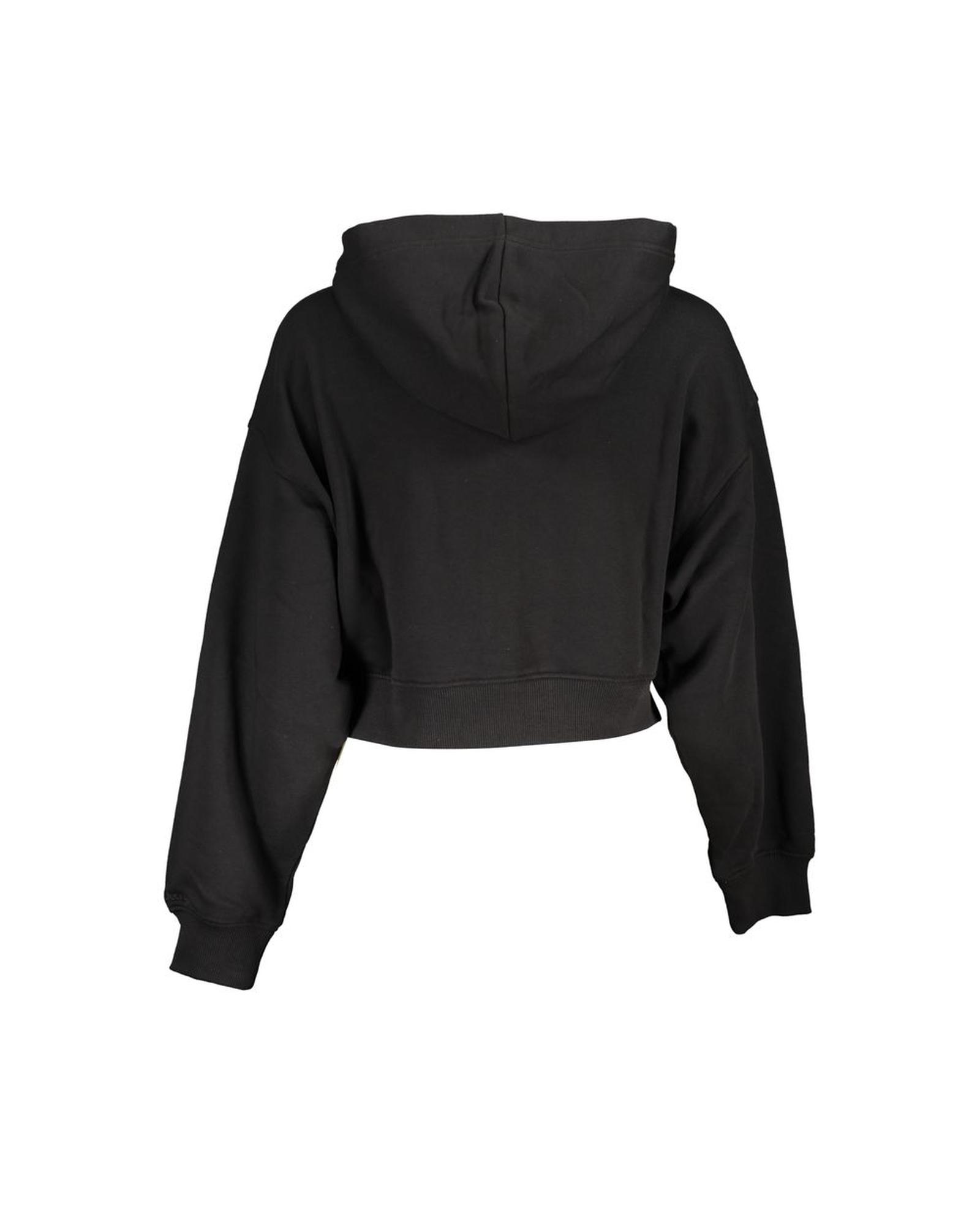 This women’s black cotton sweater features a classic hooded sweatshirt design with long sleeves and a front zip closure. It is crafted from 100% cotton, incorporating 20% recycled cotton for an eco-friendly touch. The sweater displays an iconic logo, making it a stylish addition to any wardrobe.