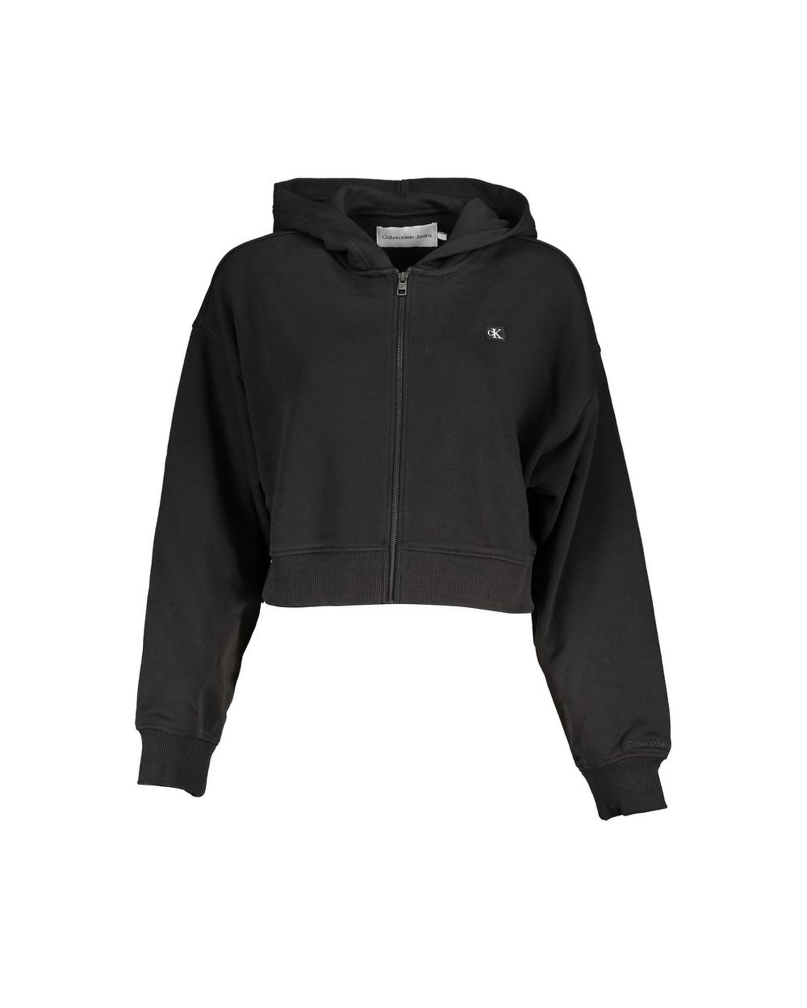 This women’s black cotton sweater offers a comfortable and stylish option for everyday wear. It features a hooded design with long sleeves and a front zipper, making it both functional and fashionable. The sweater is accented with an iconic logo and incorporates recycled cotton for an eco-friendly touch.