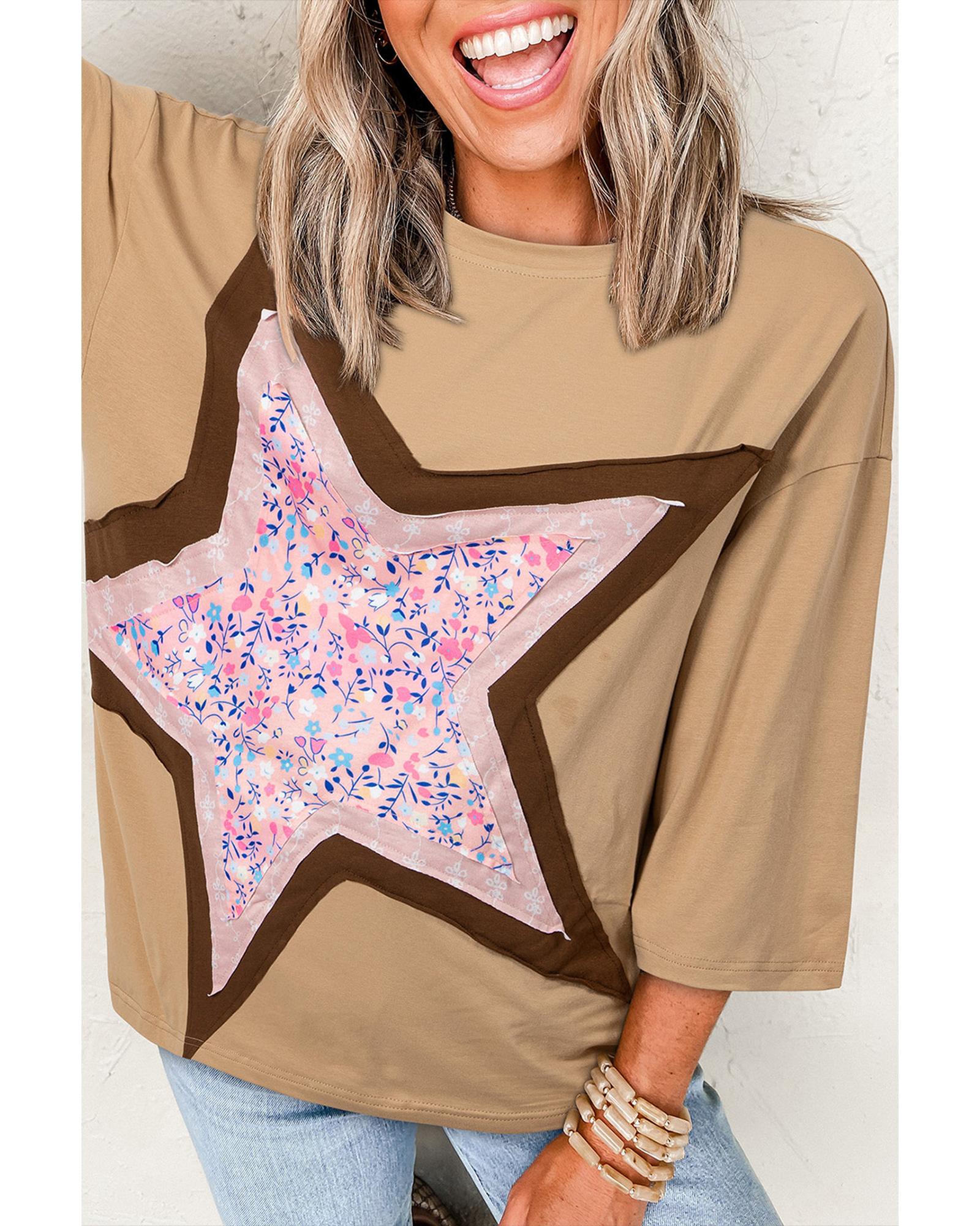 Camel Floral Star Patchwork 3/4 Long Sleeve Top – XL