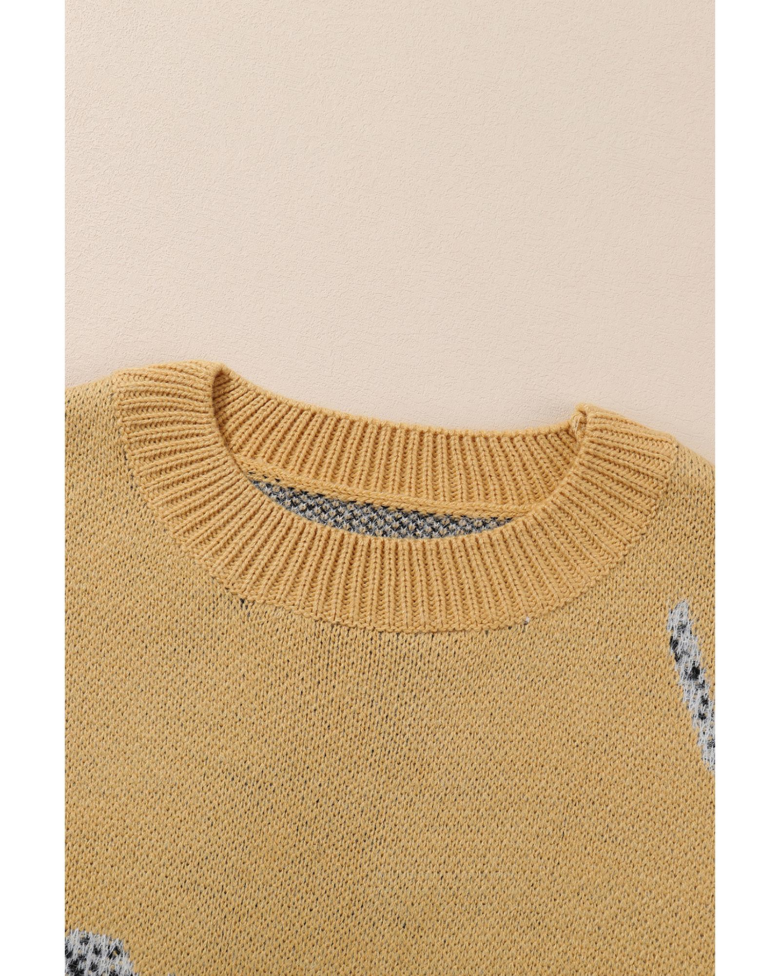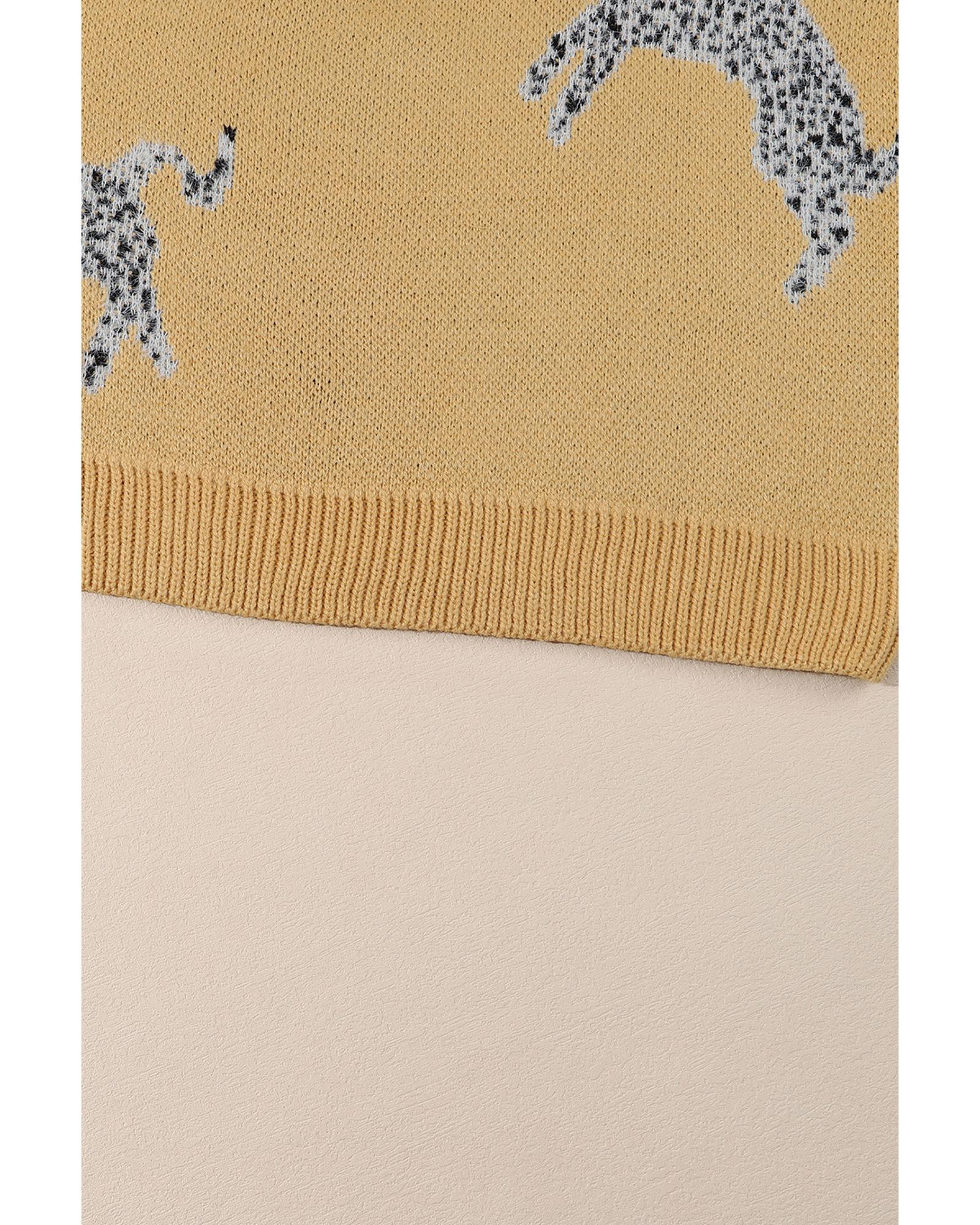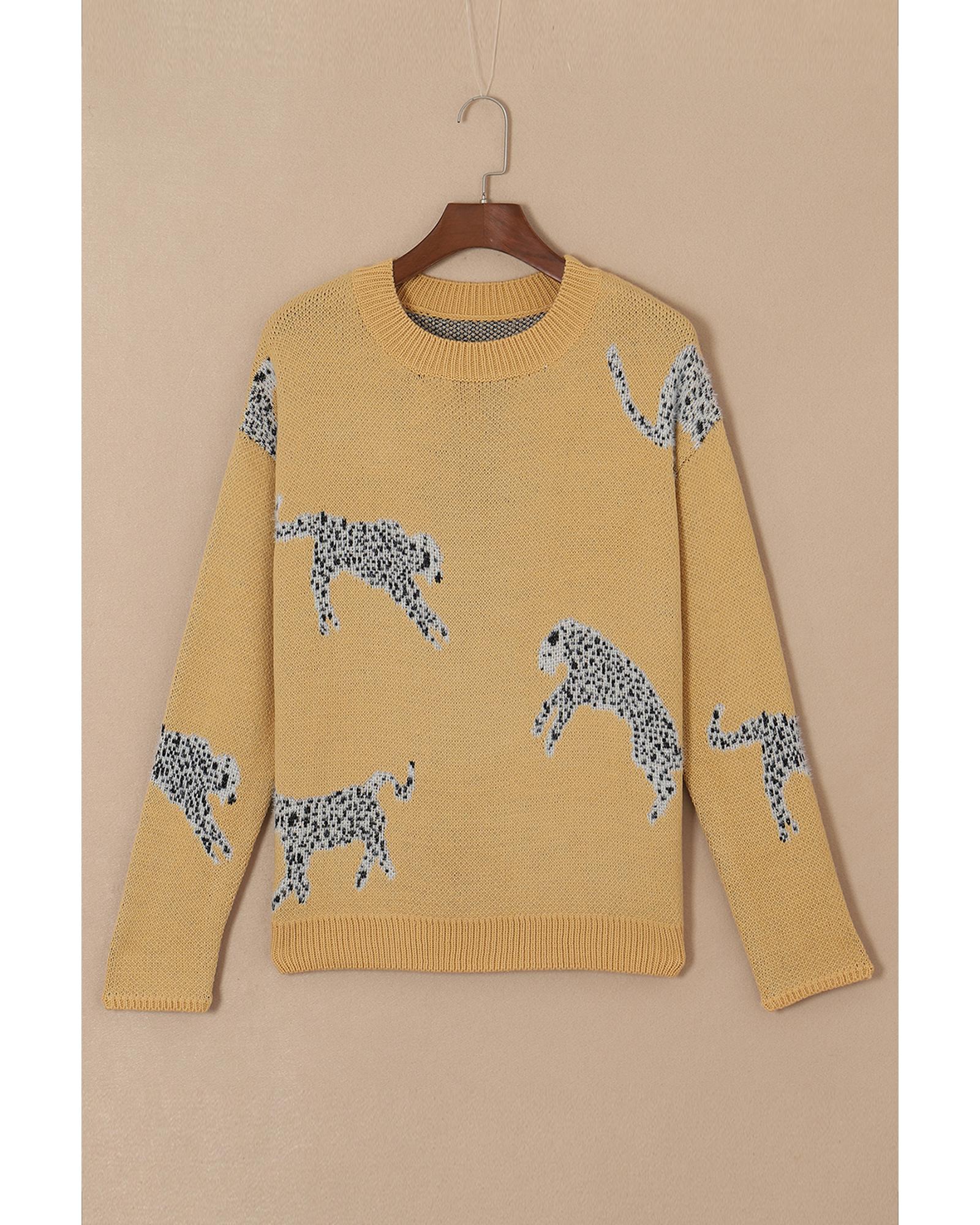 Camel Fuzzy Cheetah Accent Round Neck Sweater – L
