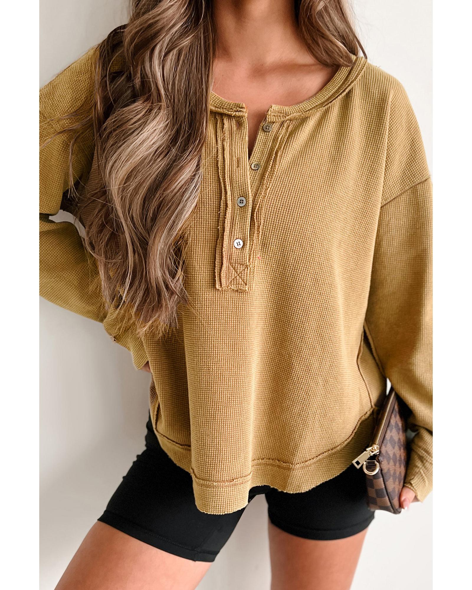 This oversized top features a textured knit fabric with a stylish drop shoulder design and half button detail. It offers a comfortable fit suitable for casual wear and layering, making it a versatile addition to any wardrobe.