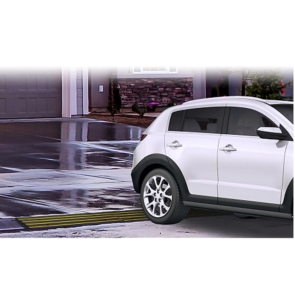 This driveway curb ramp is designed to provide a safe and smooth transition for vehicles crossing uneven channels in driveways, access roads, or construction sites. Made from durable rubber, it is weatherproof and capable of supporting heavy loads, making it suitable for various industrial and residential applications. The ramp features high-visibility stripes for enhanced safety during night use and includes a cable channel on its underside for convenient cable management.