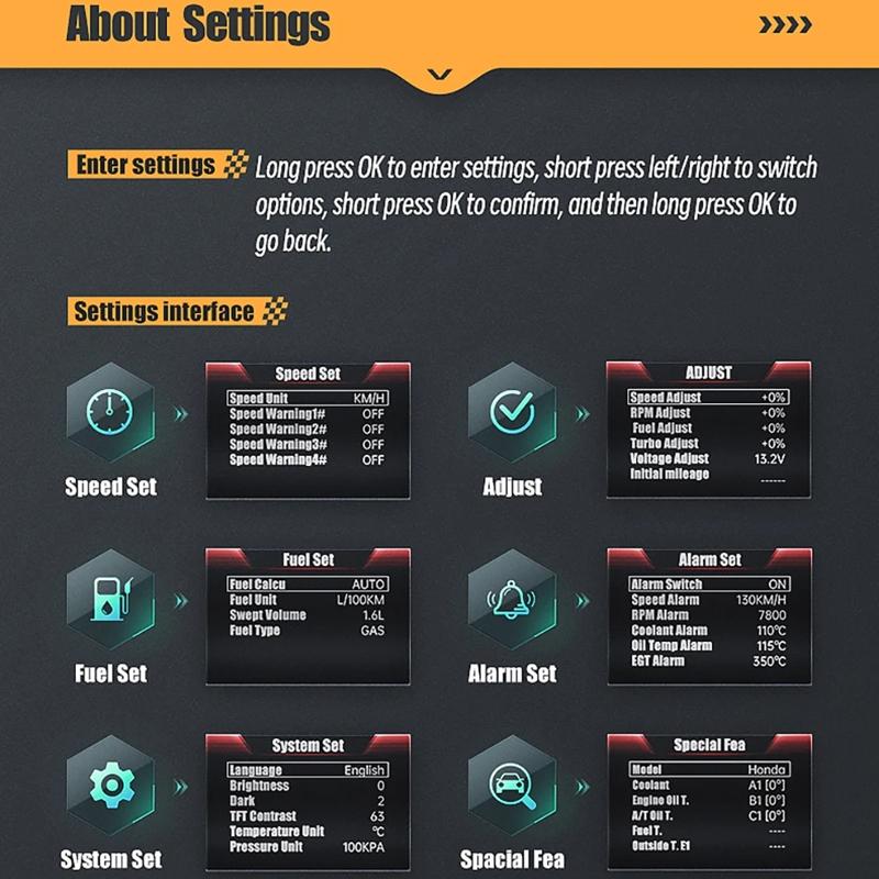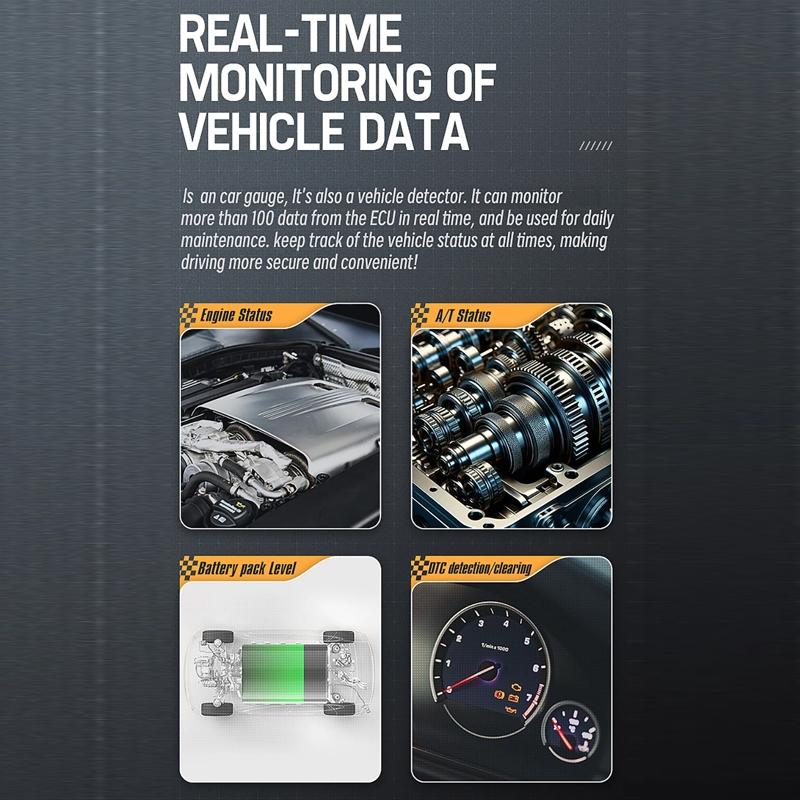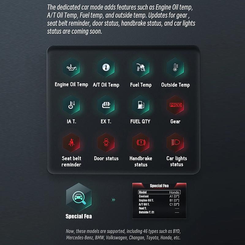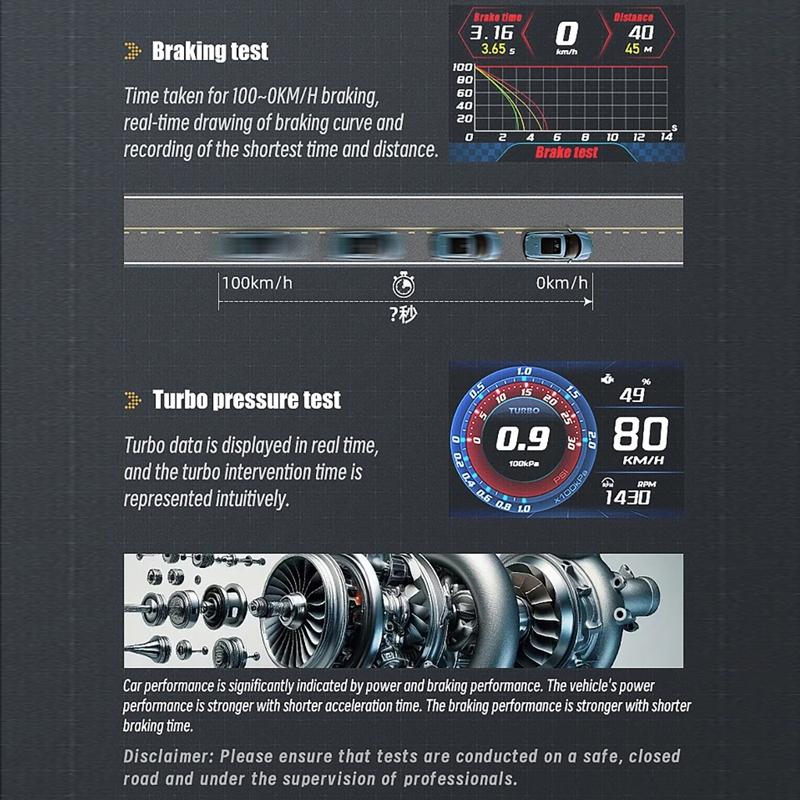 This product is a car OBD HUD LCD speedometer designed to provide clear and comprehensive vehicle data display. It features a sleek and durable design with a metal interface track, offering easy readability with large font and a high-quality LCD screen that displays a wide color gamut and high brightness. The device functions as both an OBD instrument and a vehicle detector, enabling real-time monitoring of over 100 data points for a secure and convenient driving experience. It includes a special car mode with additional functions such as oil temperature, transmission oil temperature, and outside temperature. A high-position warning light with linkage atmosphere light changes colors based on vehicle speed, enhancing safety and visibility. Professional performance parameters like acceleration time and braking distance can be obtained without external equipment.