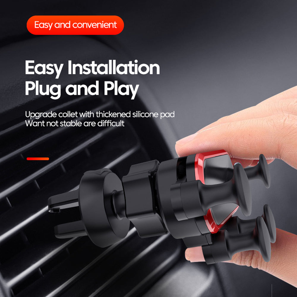 This car phone holder features a metal gravity design with a 360-degree universal rotation ball, allowing flexible adjustment of viewing angles. It is easy to install and compatible with most air outlet types, providing a secure and unobtrusive hold for your mobile device while driving.