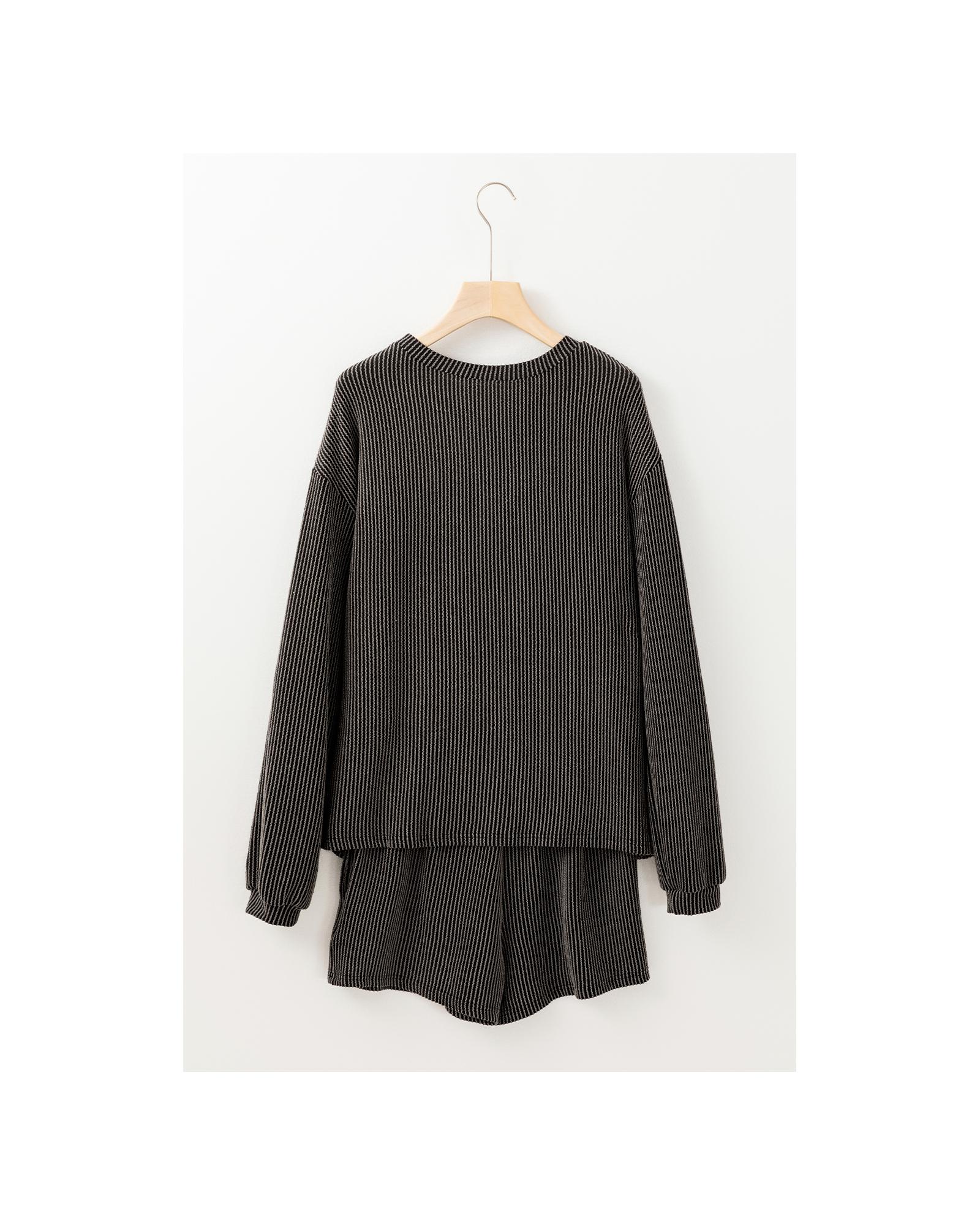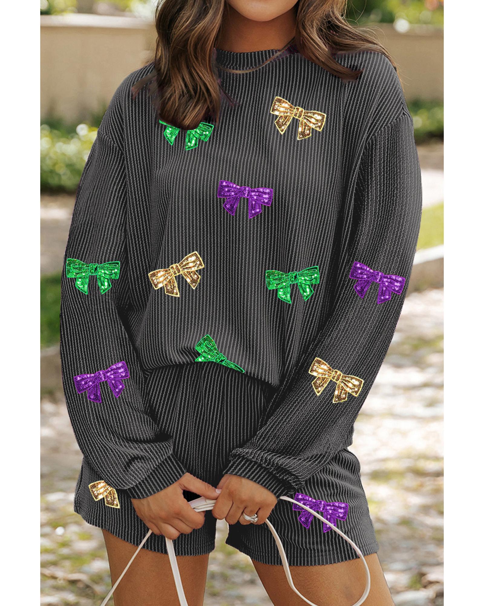 Carbon Grey Bowknot Patched Pattern Corded Long Sleeve Top and Shorts Outfit – L