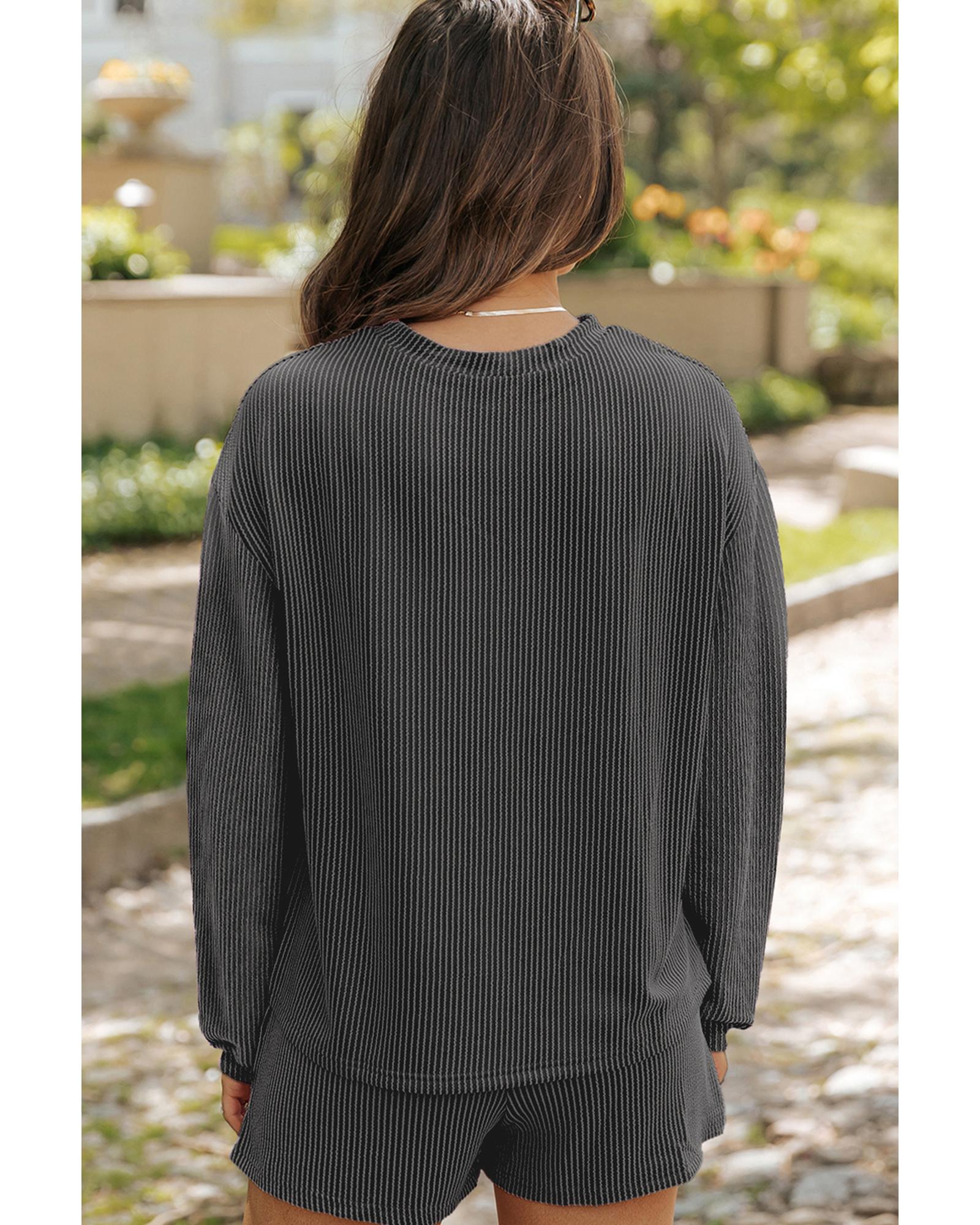 Carbon Grey Bowknot Patched Pattern Corded Long Sleeve Top and Shorts Outfit – XL