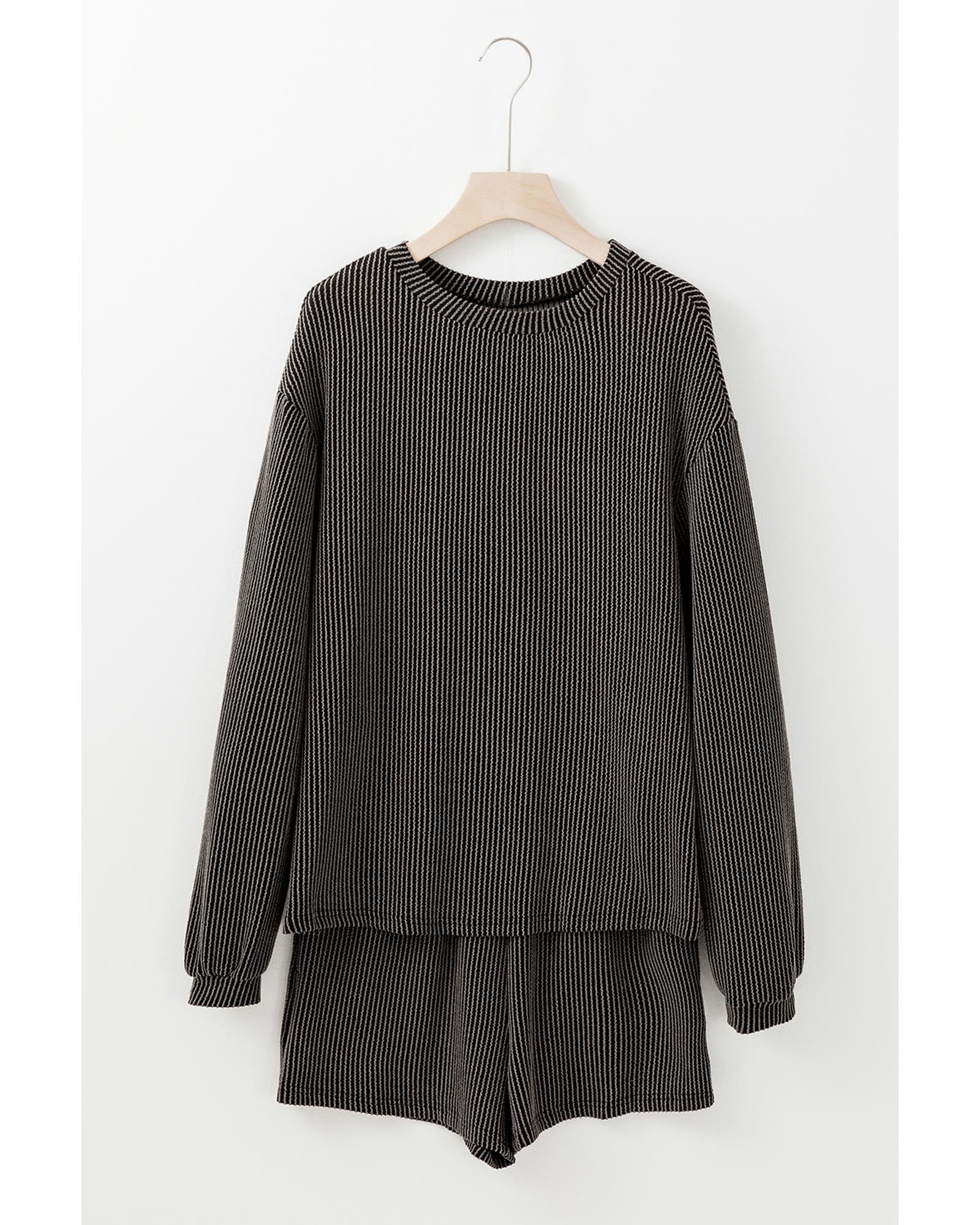 Carbon Grey Corded Knit Long Sleeve Top and High Waist Shorts Set – S