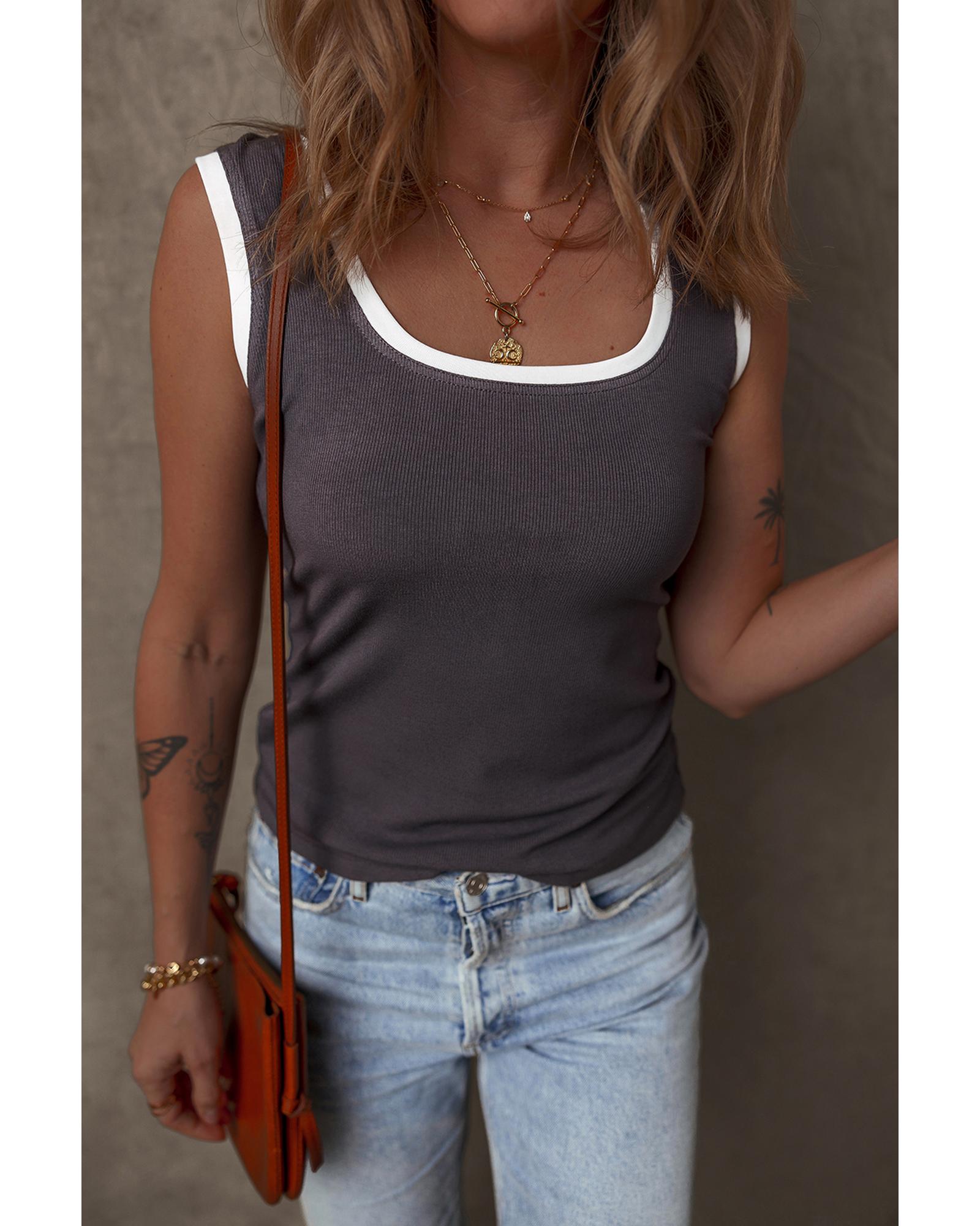 Carbon Grey Ribbed Knit Colorblock Edge U Neck Slim Fit Tank Top – M