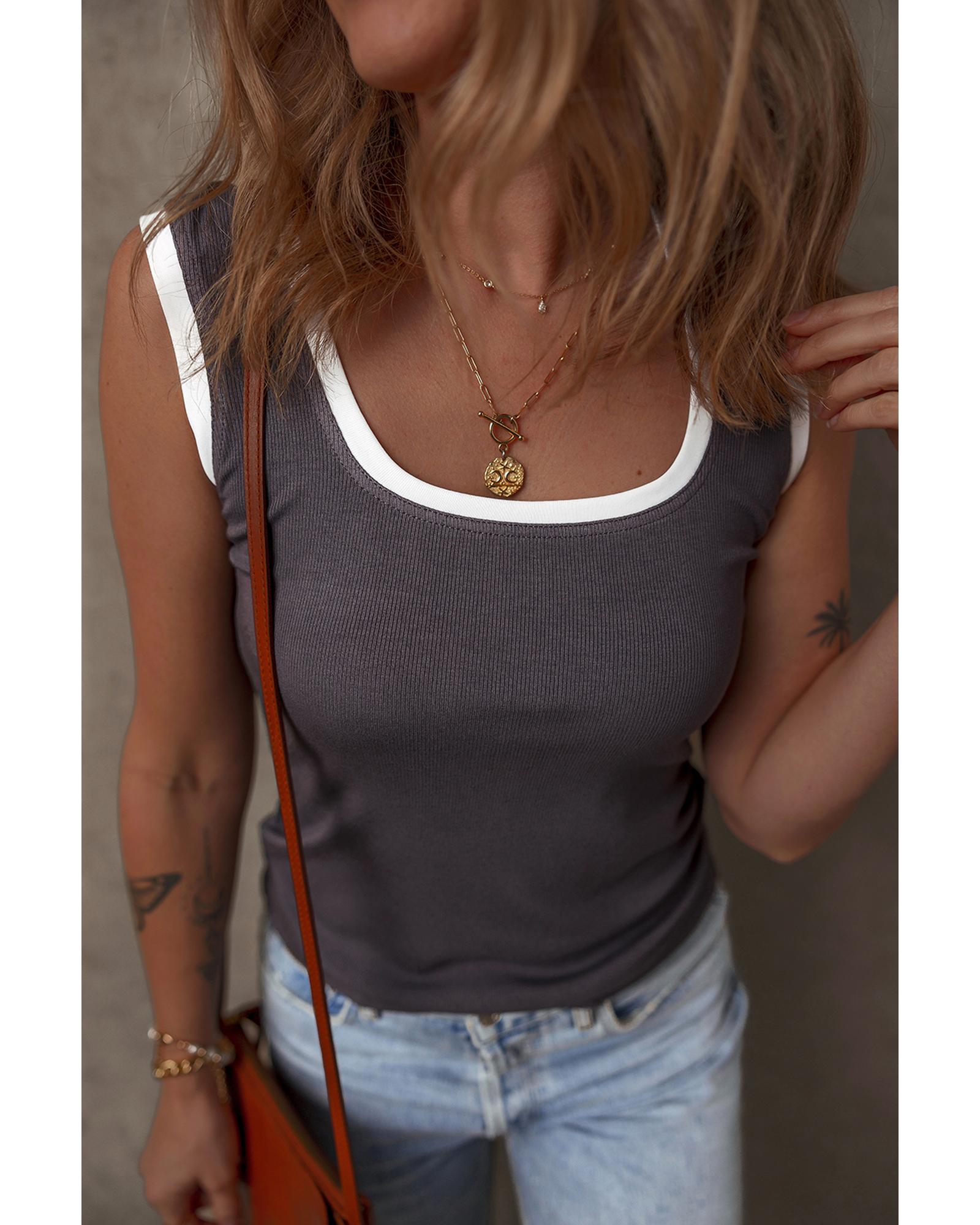 This ribbed knit tank top features a stylish colorblock edge design with a modern U neckline. Its slim fit silhouette is crafted to accentuate the figure, making it suitable for layering or wearing alone. The cozy fabric provides comfort and versatility for various outfits.