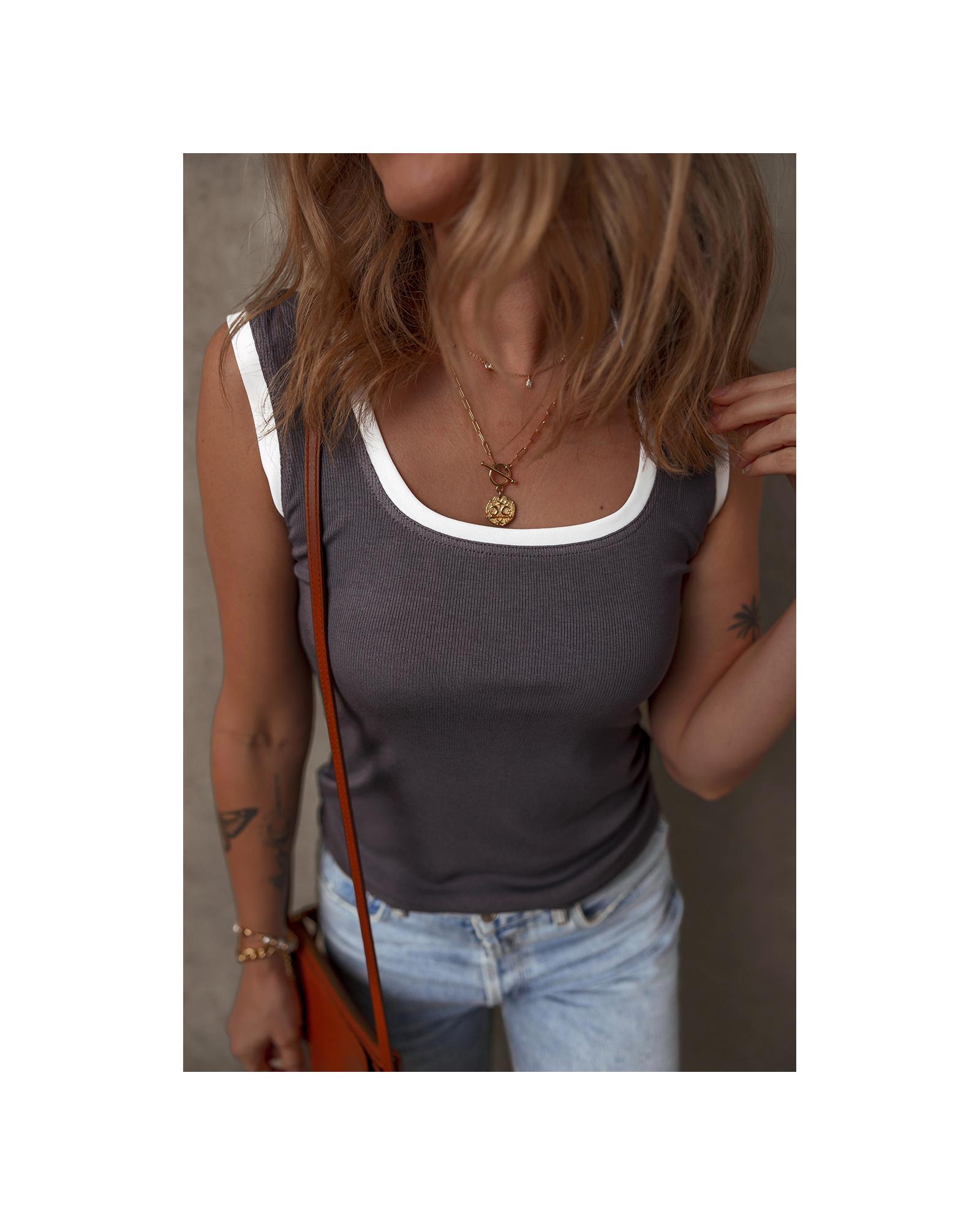 Carbon Grey Ribbed Knit Colorblock Edge U Neck Slim Fit Tank Top – XL