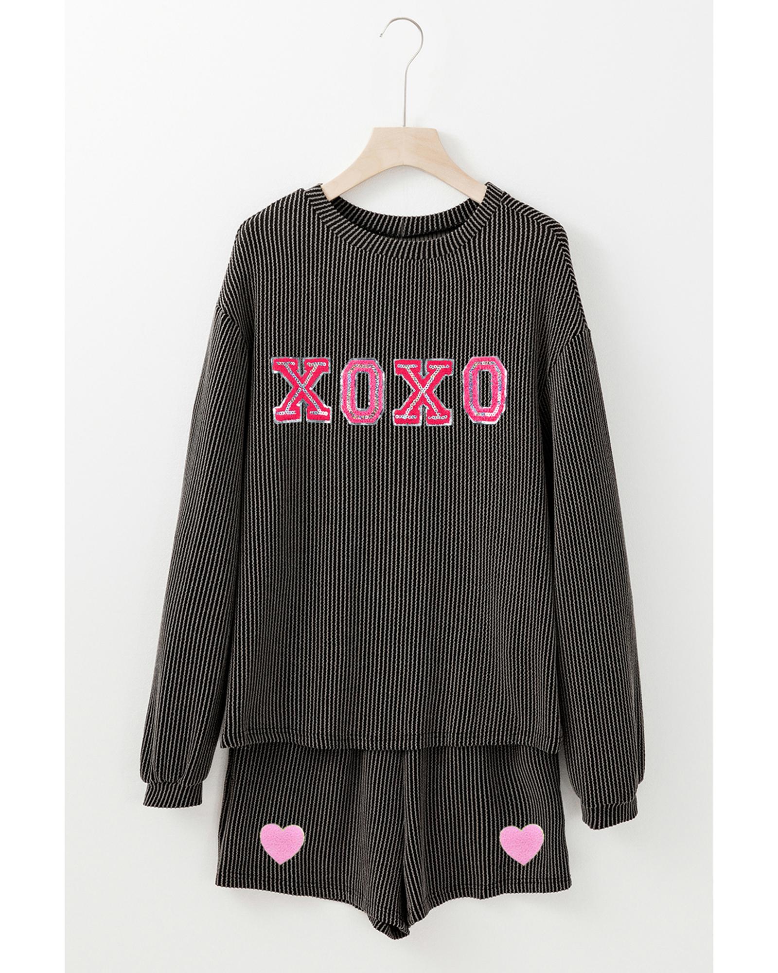 Carbon Grey XOXO Heart Patched Pattern Long Sleeve Corded Shorts Set – S