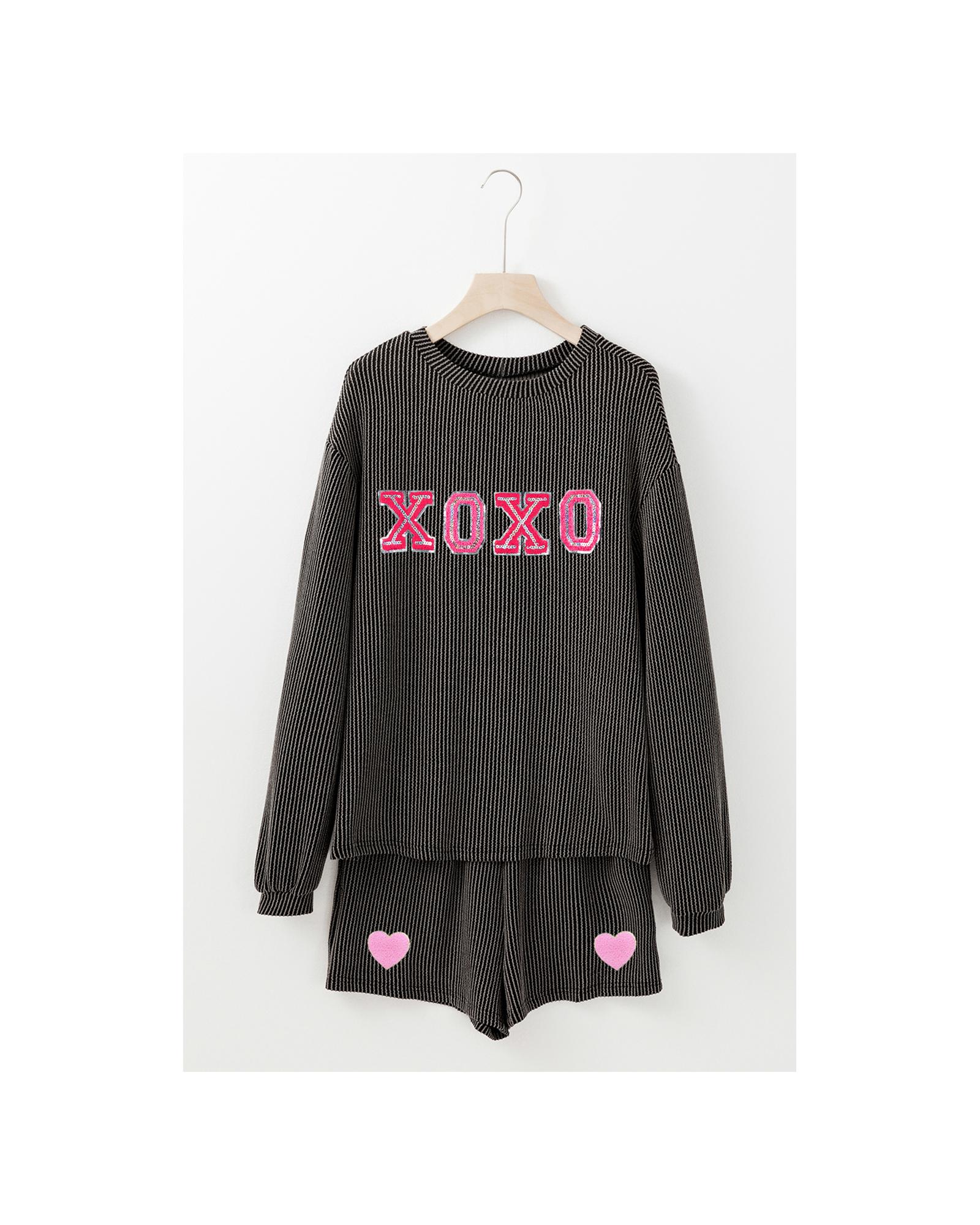 Carbon Grey XOXO Heart Patched Pattern Long Sleeve Corded Shorts Set – XL