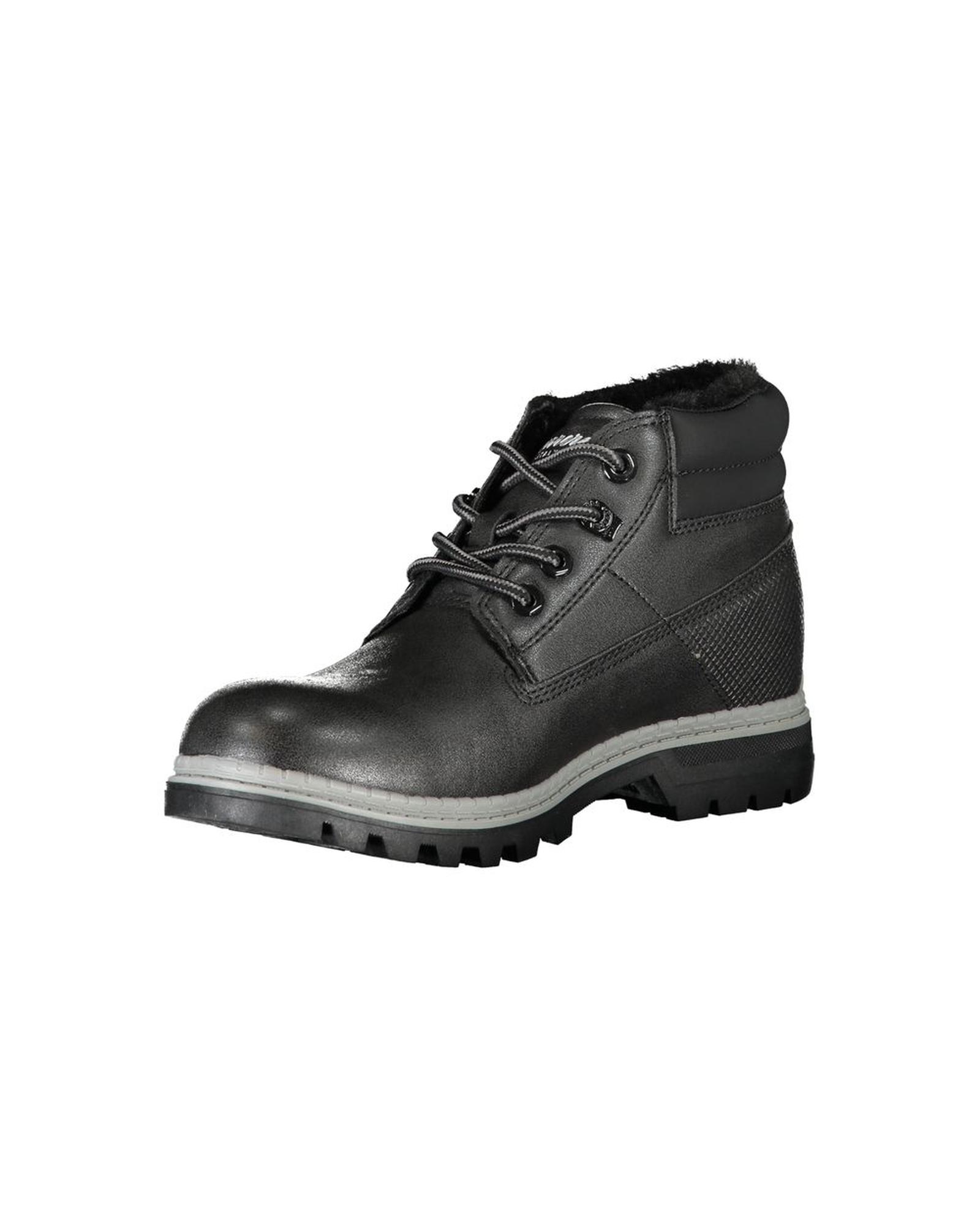 This women’s black polyester boot features a stylish design with contrast details and a lace-up closure. It offers a comfortable fit and a sleek appearance suitable for various occasions.