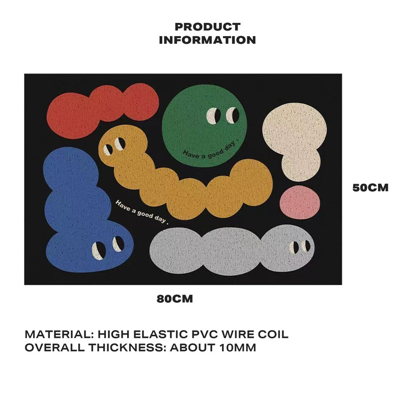 This cartoon-themed door entry mat features a playful design and practical functionality. It is suitable for both indoor and outdoor use, providing an effective solution for scraping mud and dirt from shoes. The mat is easy to clean and maintain, making it a convenient addition to any entryway.