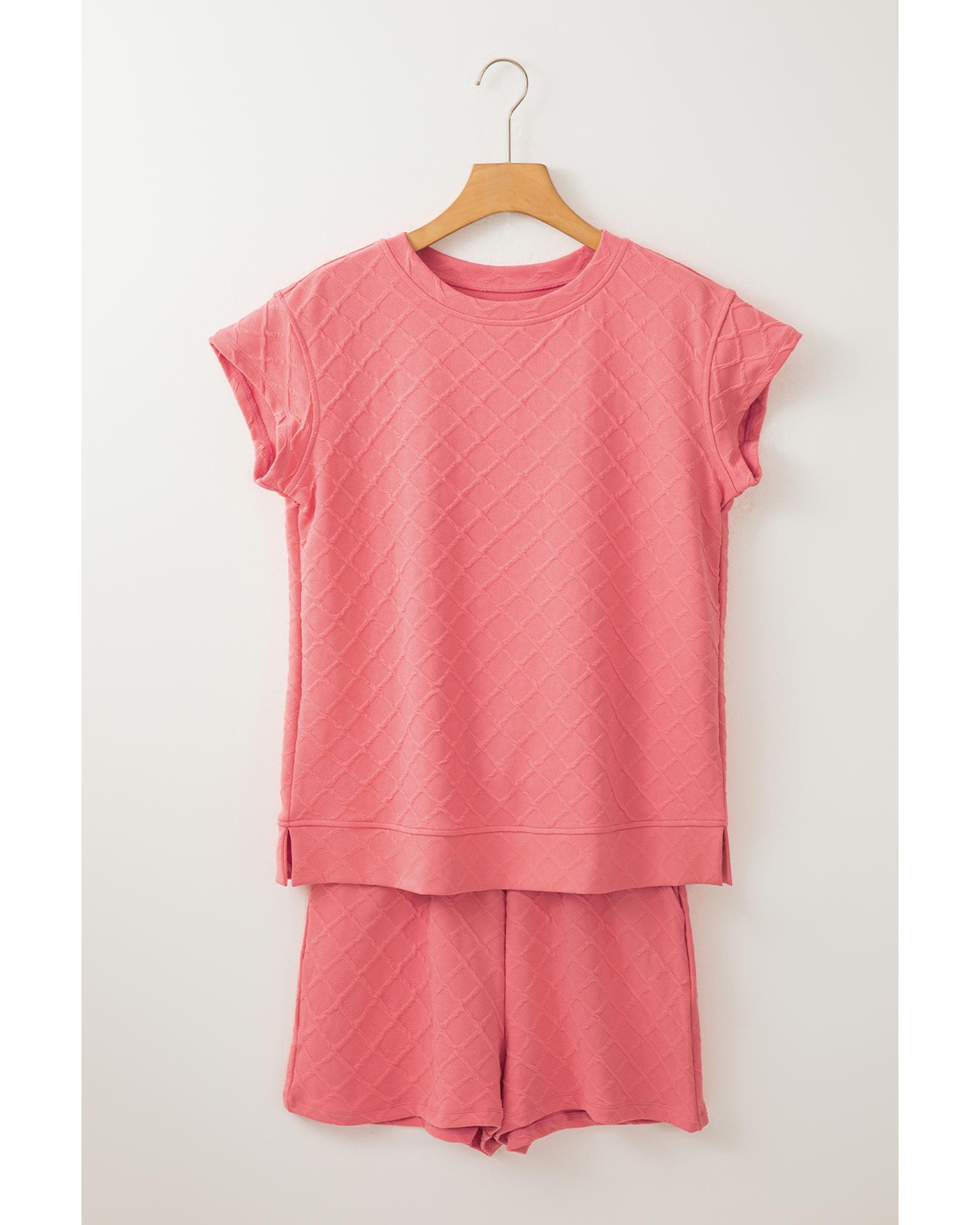 This casual checkered textured tee and drawstring shorts set offers a trendy and comfortable look suitable for various occasions. Designed with a modern twist, the set features a classic solid color top and adjustable shorts for a personalized fit. Made from a high-elasticity fabric blend, it ensures comfort and flexibility throughout the day.