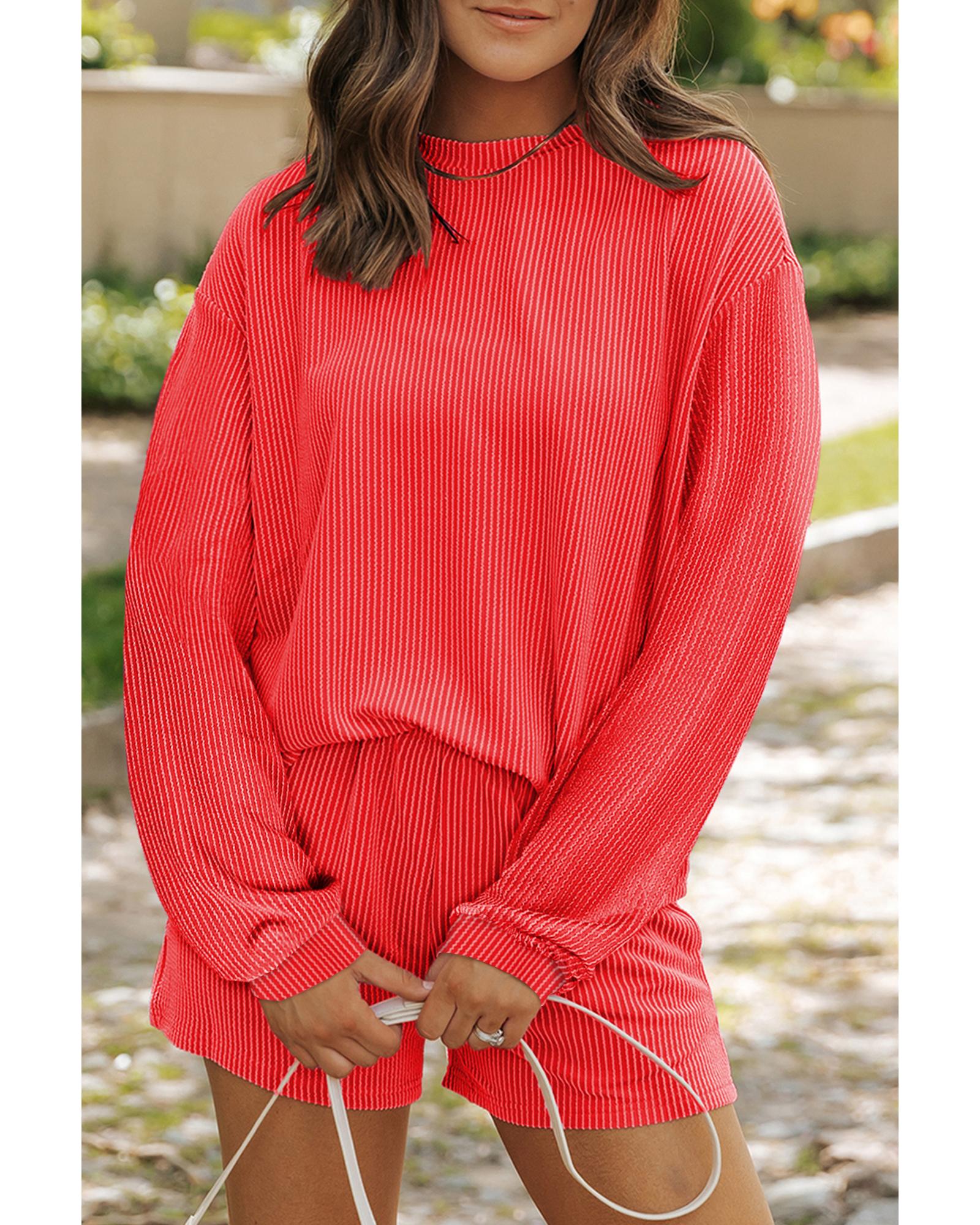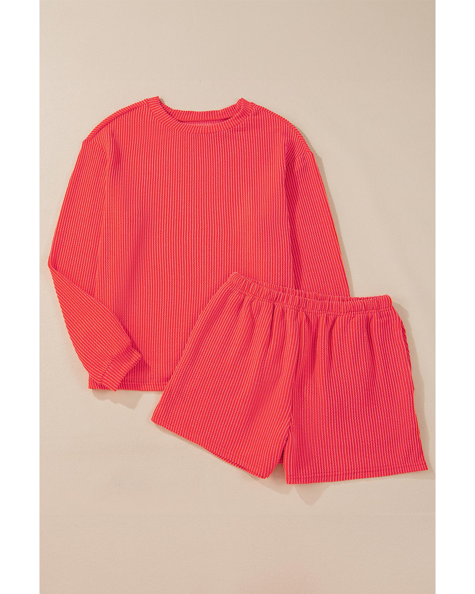 Casual Corded Knit Long Sleeve Top and High Waist Shorts Set – L