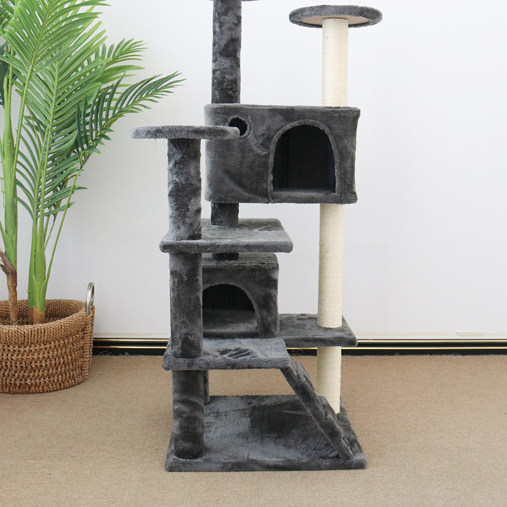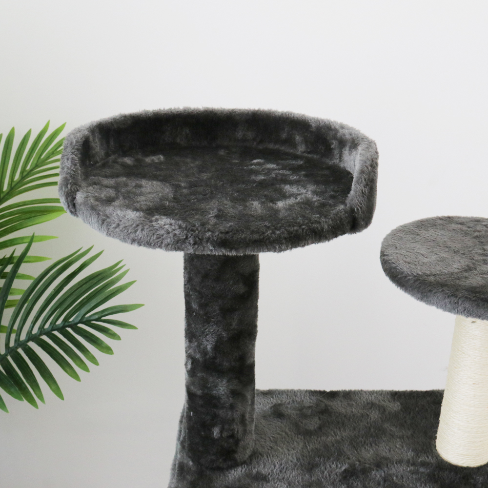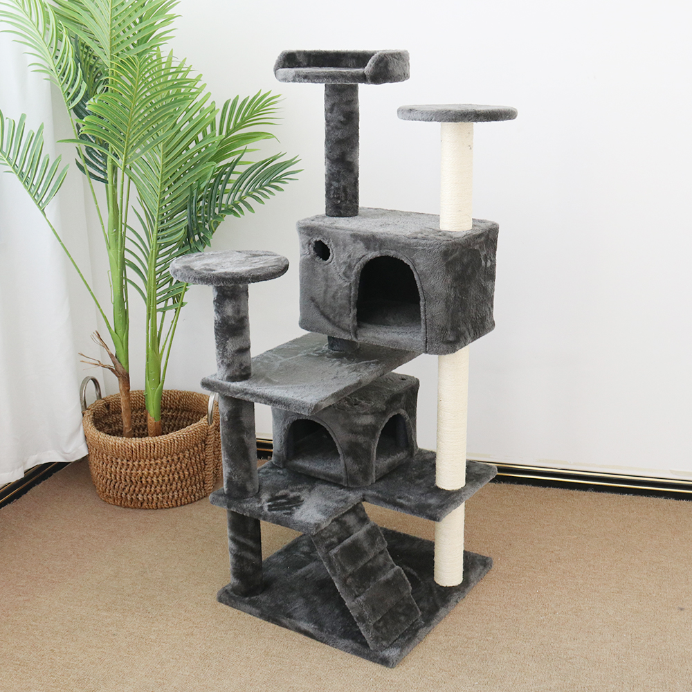 This cat scratching tree is designed to provide a stylish and functional space for cats to scratch, perch, and relax. It features multiple surfaces and cozy spots, making it suitable for single or multiple cats. The tree helps satisfy natural scratching instincts and offers various heights for climbing and resting.