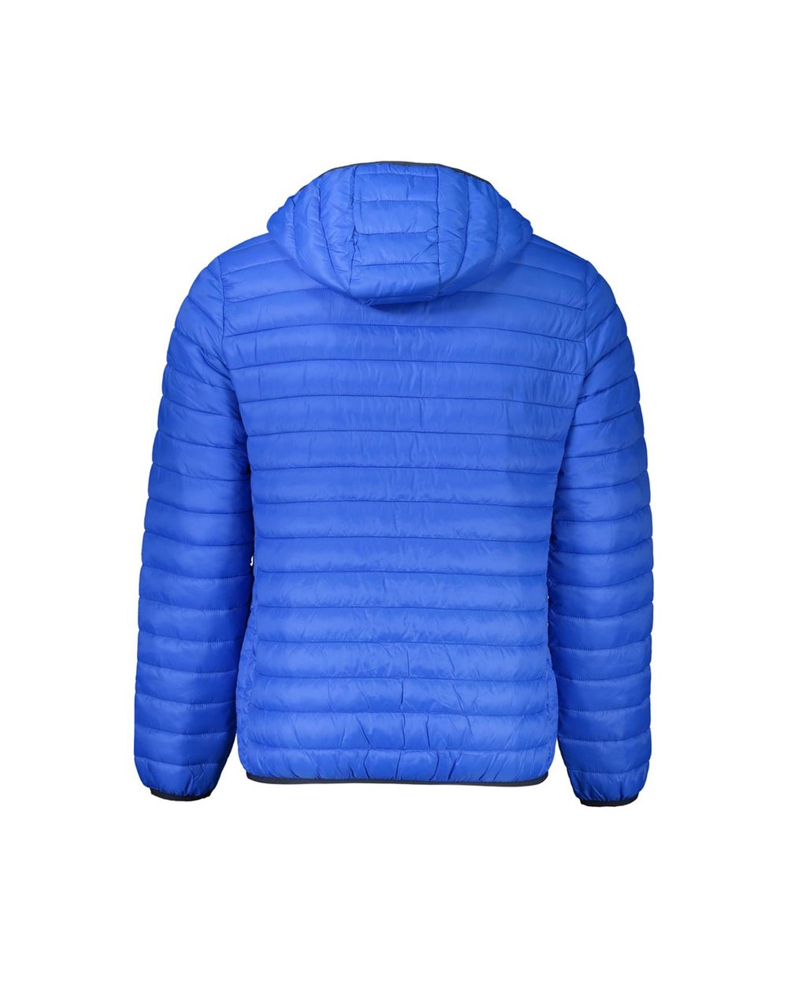 This men’s jacket features a stylish blue color with a lightly padded design, making it suitable for various weather conditions. It offers a practical hood and a sleek zip front for easy wear. The jacket includes multiple pockets for convenience and a distinctive logo applique for a fashionable touch.