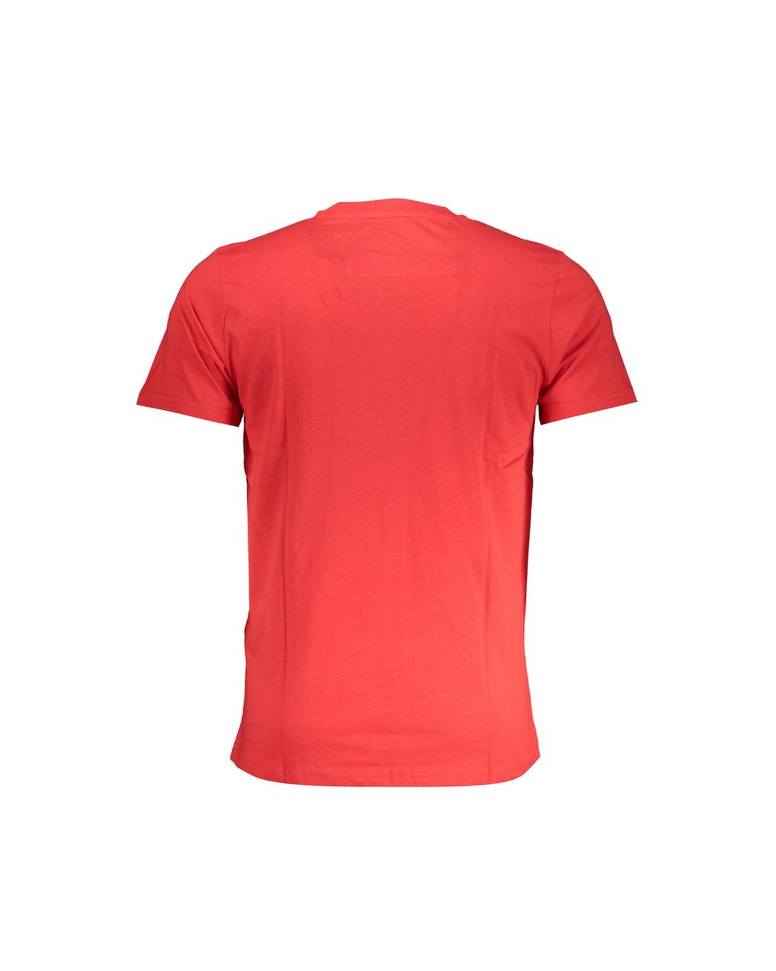 This men’s red cotton T-shirt combines comfort and style, making it a versatile addition to any wardrobe. Designed with a striking print featuring a logo, it offers a fashionable look suitable for various casual occasions.