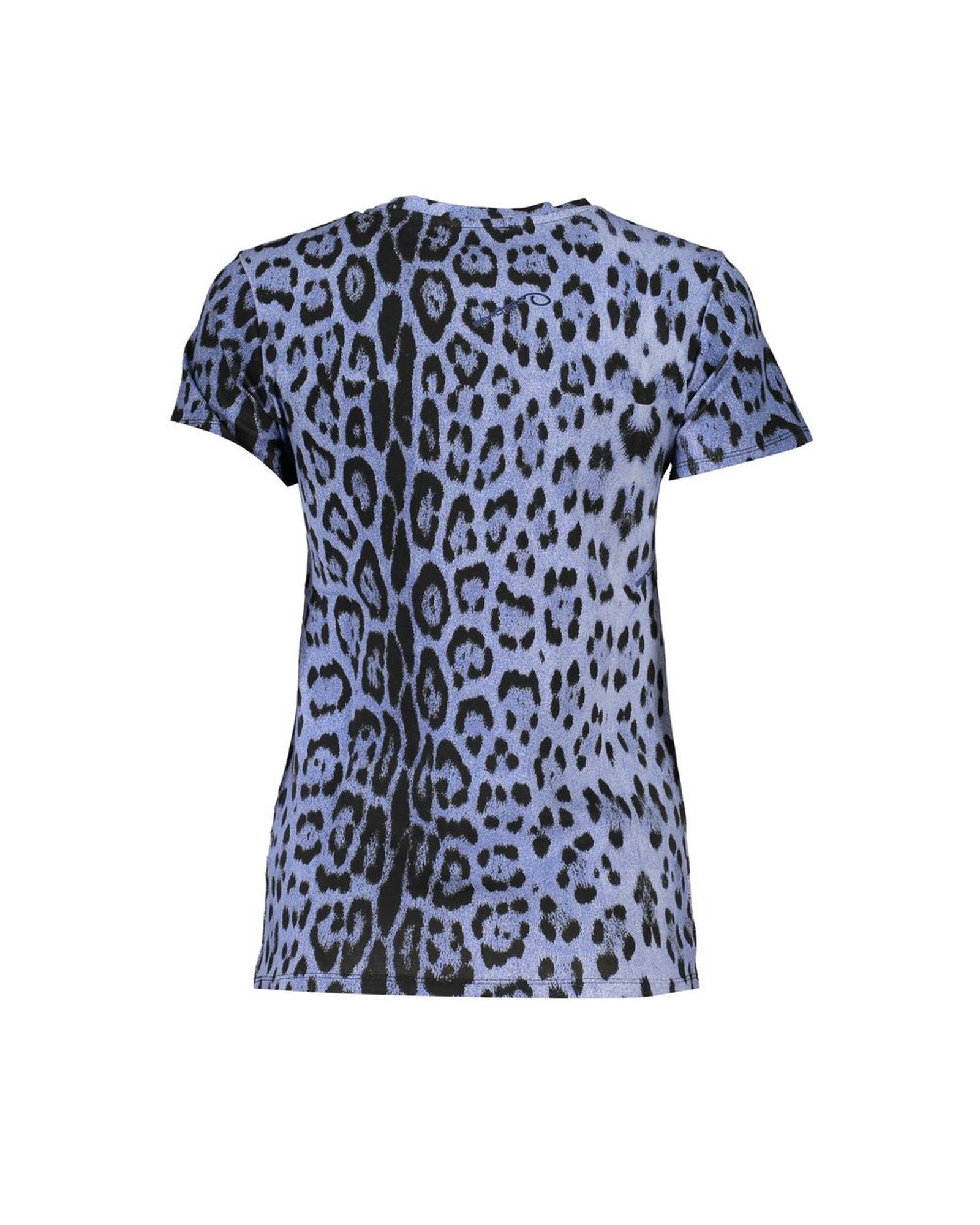 This women’s short-sleeved t-shirt features a light blue cotton material with a unique pattern and a classic crew neck design. It is suitable for casual and fashionable wear, offering comfort and style.