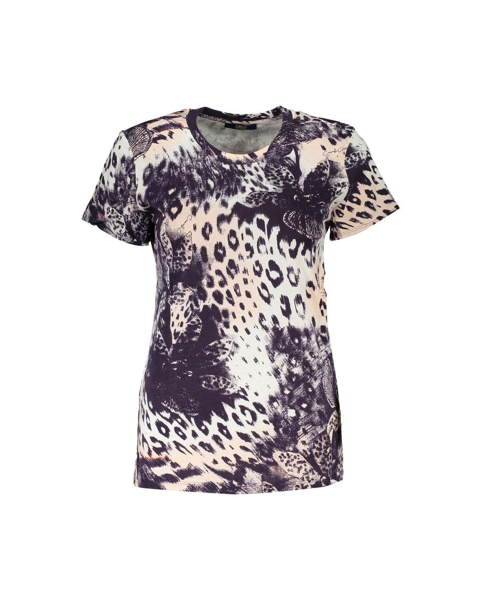 This women’s cotton T-shirt features a vibrant eye-catching pattern and a bold logo print, making it a stylish addition to any wardrobe. Designed with short sleeves and a wide neckline, it offers both comfort and a fashionable look. Crafted from high-quality cotton with a touch of elastane, it provides a comfortable fit for everyday wear.