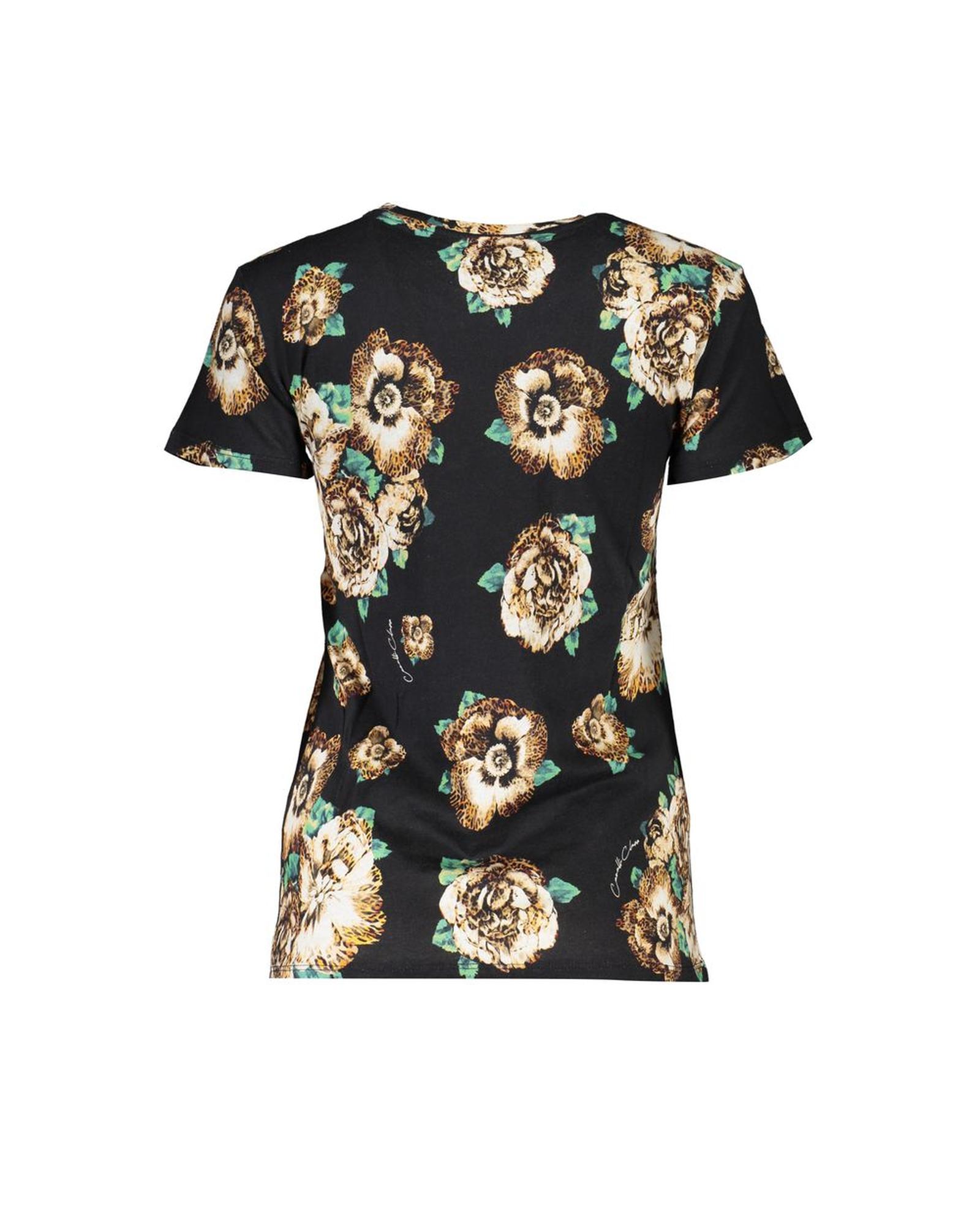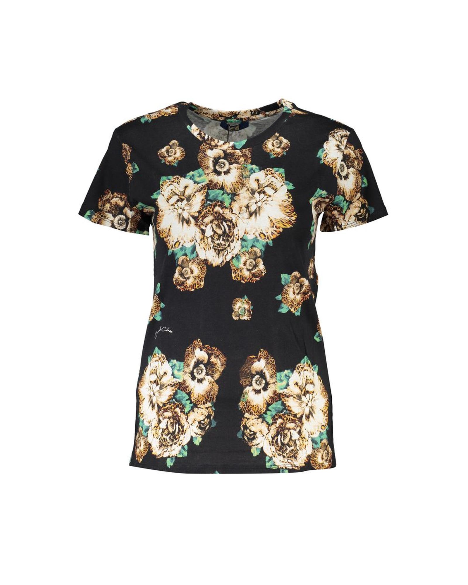 This women’s short-sleeved T-shirt features a stylish patterned design with a crew neck. Made from high-quality cotton, it offers comfort and a fashionable look. The shirt is designed to suit women and showcases a beautiful print and logo for added style.
