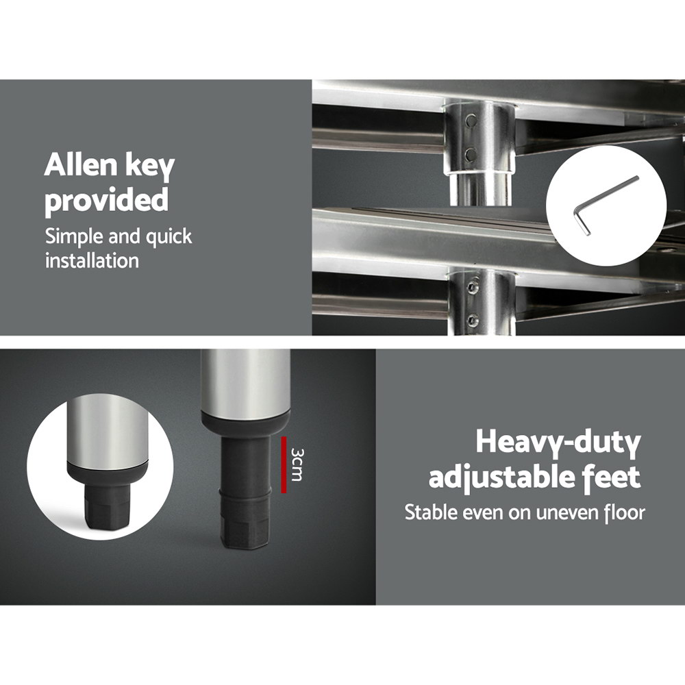 This stainless steel kitchen bench with wheels offers a durable and functional workspace suitable for various environments such as homes, cafes, and restaurants. Its spacious design and adjustable features make it a versatile addition to any kitchen setup.