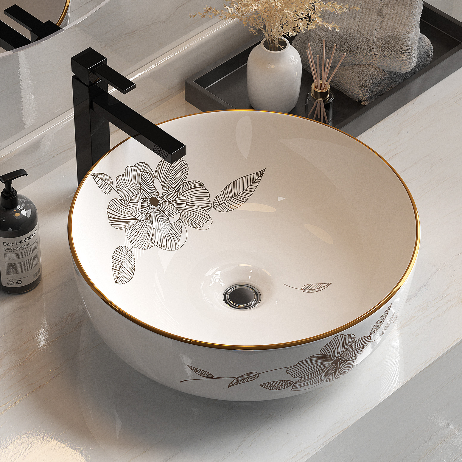 This bathroom basin features a modern design with a flower-patterned high-gloss finish, adding elegance to any bathroom decor. Made from durable ceramic, it is designed to be practical, easy to maintain, and resistant to scratches, bacteria, leaks, and odors. The basin is heat-resistant, wear-resistant, crack-resistant, and fade-resistant, ensuring long-lasting performance. Its smooth edges provide safety and comfort, and it is suitable for above-counter installation.