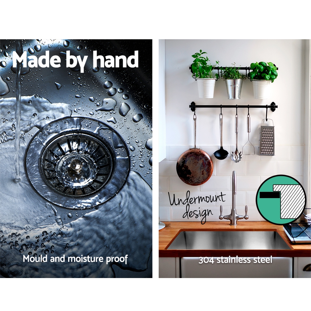 The stainless steel kitchen sink features a durable construction with a sleek satin finish. Designed for practicality and safety, it includes a deep single bowl with rounded corners, an efficient drainage system, and soundproofing elements. Suitable for various installation types, it combines quality materials with thoughtful design for an ideal kitchen addition.