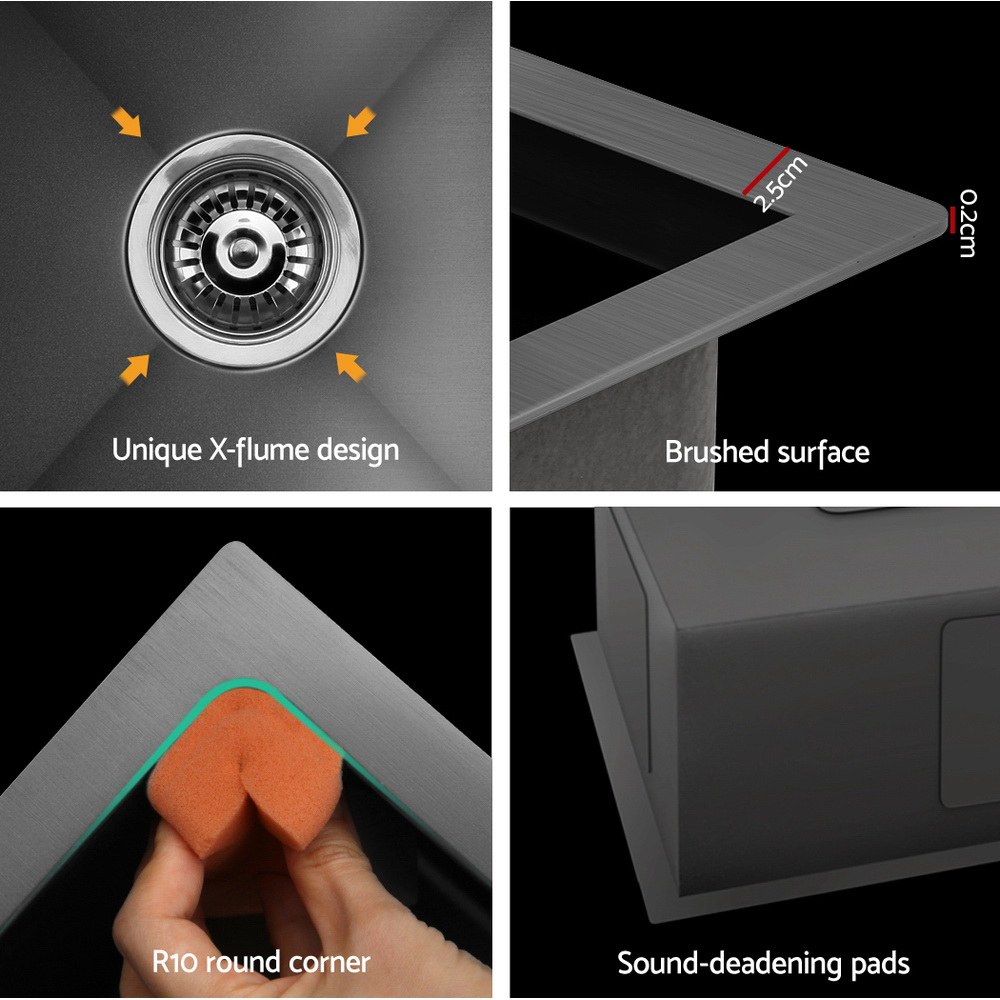 This stainless steel kitchen sink is designed for durability and practicality, featuring a deep, wide bowl and an easy-drain X-flume design. Crafted from high-quality food-grade stainless steel, it offers a smooth satin finish, R10 rounded corners for safety and cleaning, and sound-deadening pads to reduce noise. Suitable for various installation types, it combines quality materials with thoughtful features for an efficient kitchen experience.