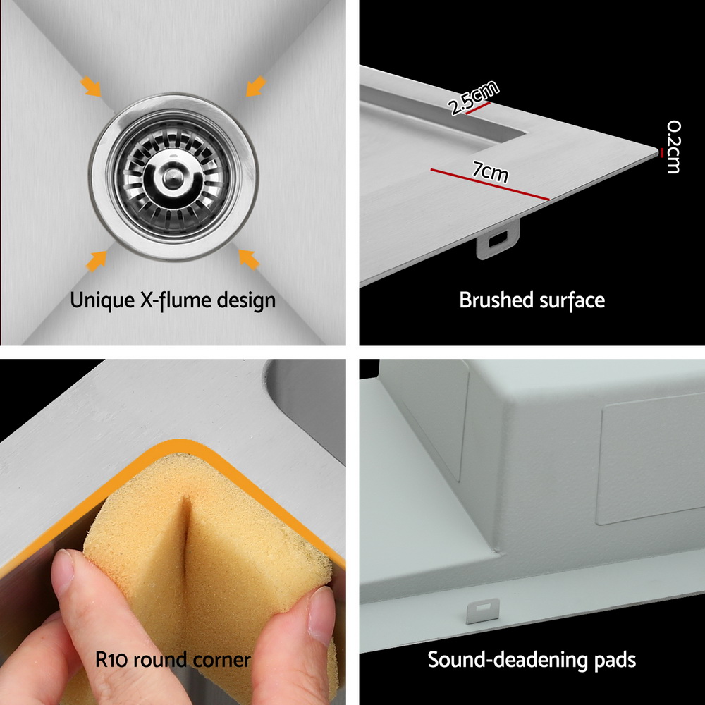 This artisan-crafted stainless steel sink is designed for versatile installation options, including under-mount, flush-mount, and drop-in setups. Made from durable 304 stainless steel, it features a satin-coated finish for a smooth, luxurious appearance. The sink is equipped with anti-condensation, mould-resistant, and moisture-resistant paint, along with sound-deadening pads to ensure quiet operation. Its R10 rounded corners facilitate easy cleaning, and the X-flume design allows for efficient water drainage.
