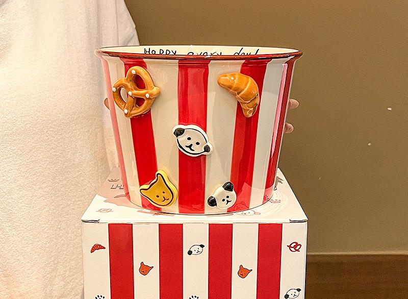This charming striped ceramic bowl is designed for serving instant noodles, soup, cereal, or snacks. It features a whimsical design with vertical stripes and three-dimensional appliqu??s of cartoon characters and baked goods. The bowl is decorated with a cheerful message inside the rim, making mealtime more enjoyable. Its smooth glaze ensures easy cleaning, while the unglazed bottom provides stability during use. Packaged in a matching striped gift box, it makes a delightful gift for noodle lovers or a lovely addition to your kitchen collection.