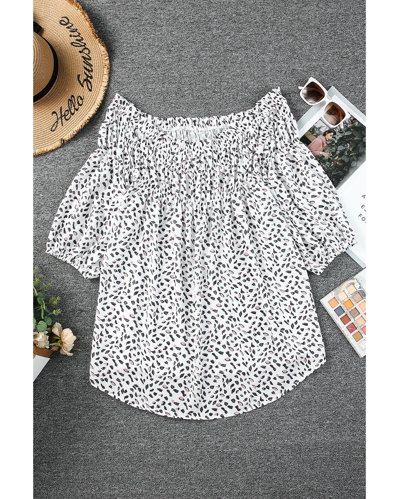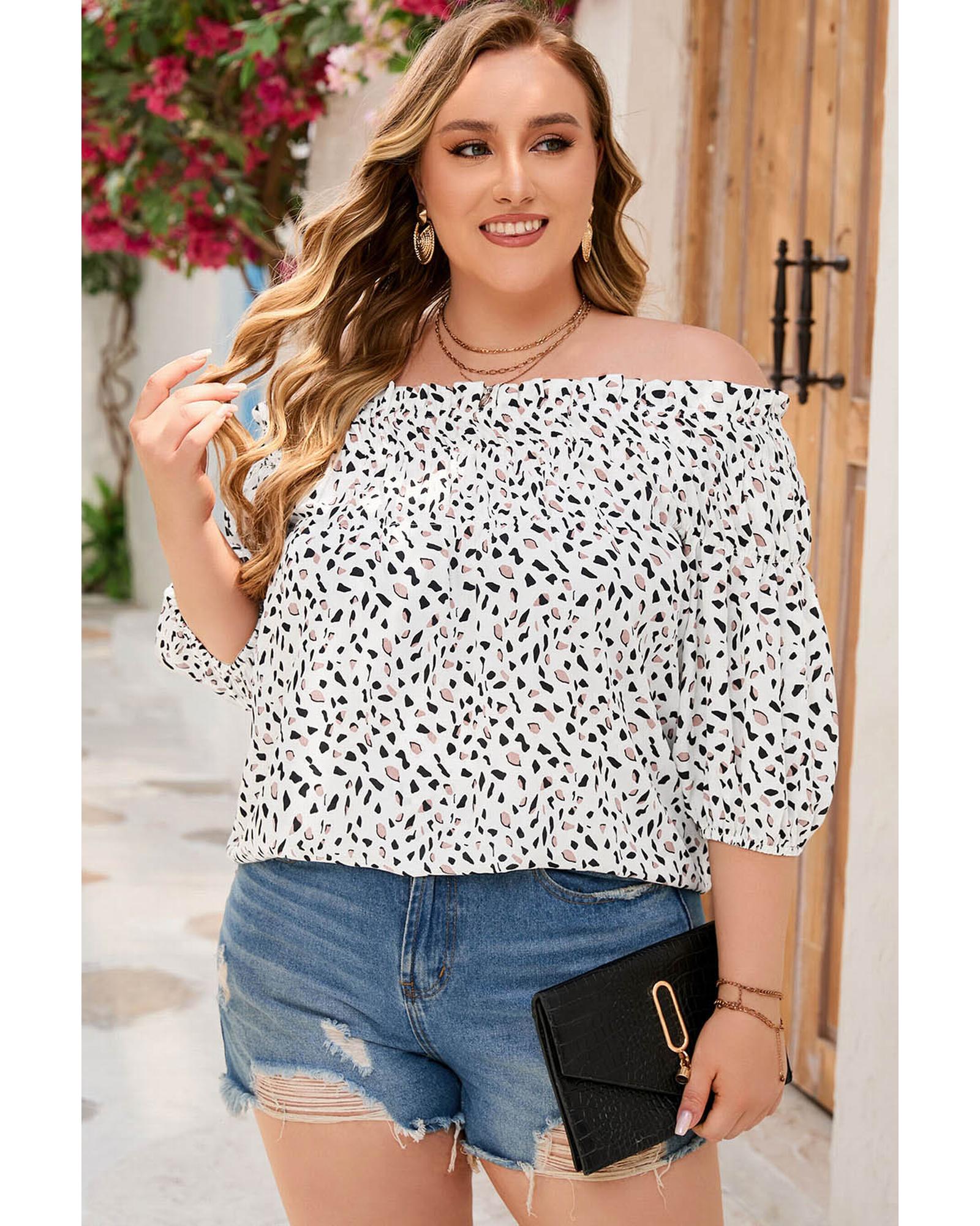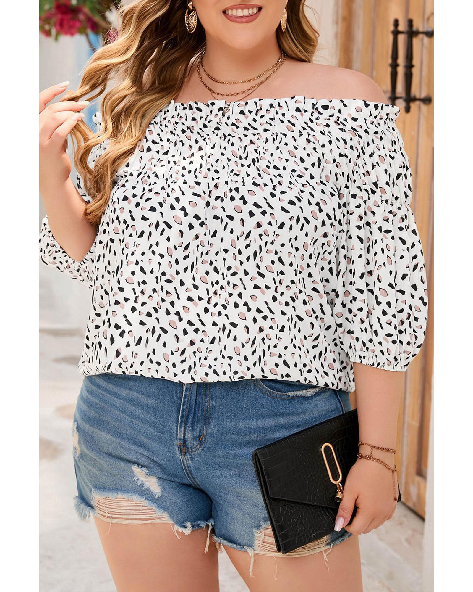 This stylish off-shoulder blouse features a trendy spotted print and a feminine design, making it suitable for various casual and dressy occasions. Its loose and flowy fit provides comfort and elegance, perfect for plus-size women looking for a fashionable look.