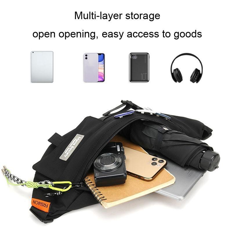 This chest shoulder messenger bag features a durable and high-density Oxford cloth construction, offering scratch resistance and water repellency. Its multi-compartment design allows for organized storage, making it suitable for both men and women. The bag is designed for comfort with a shoulder strap buckle that reduces pressure and a soft, comfortable touch.