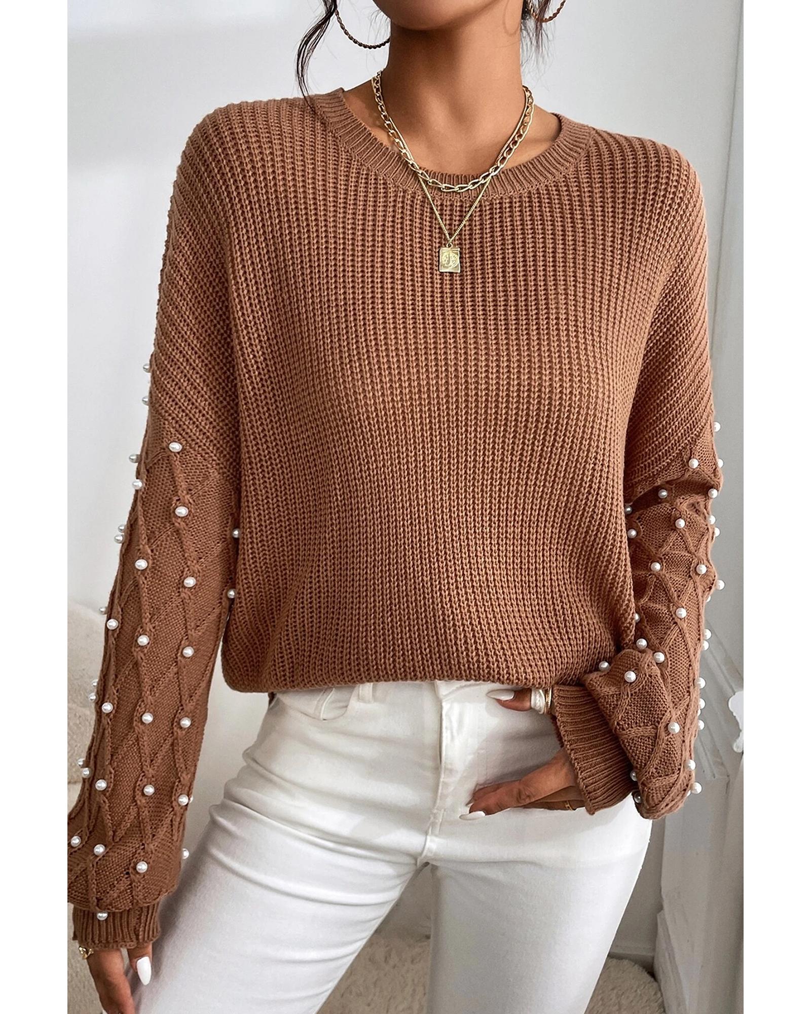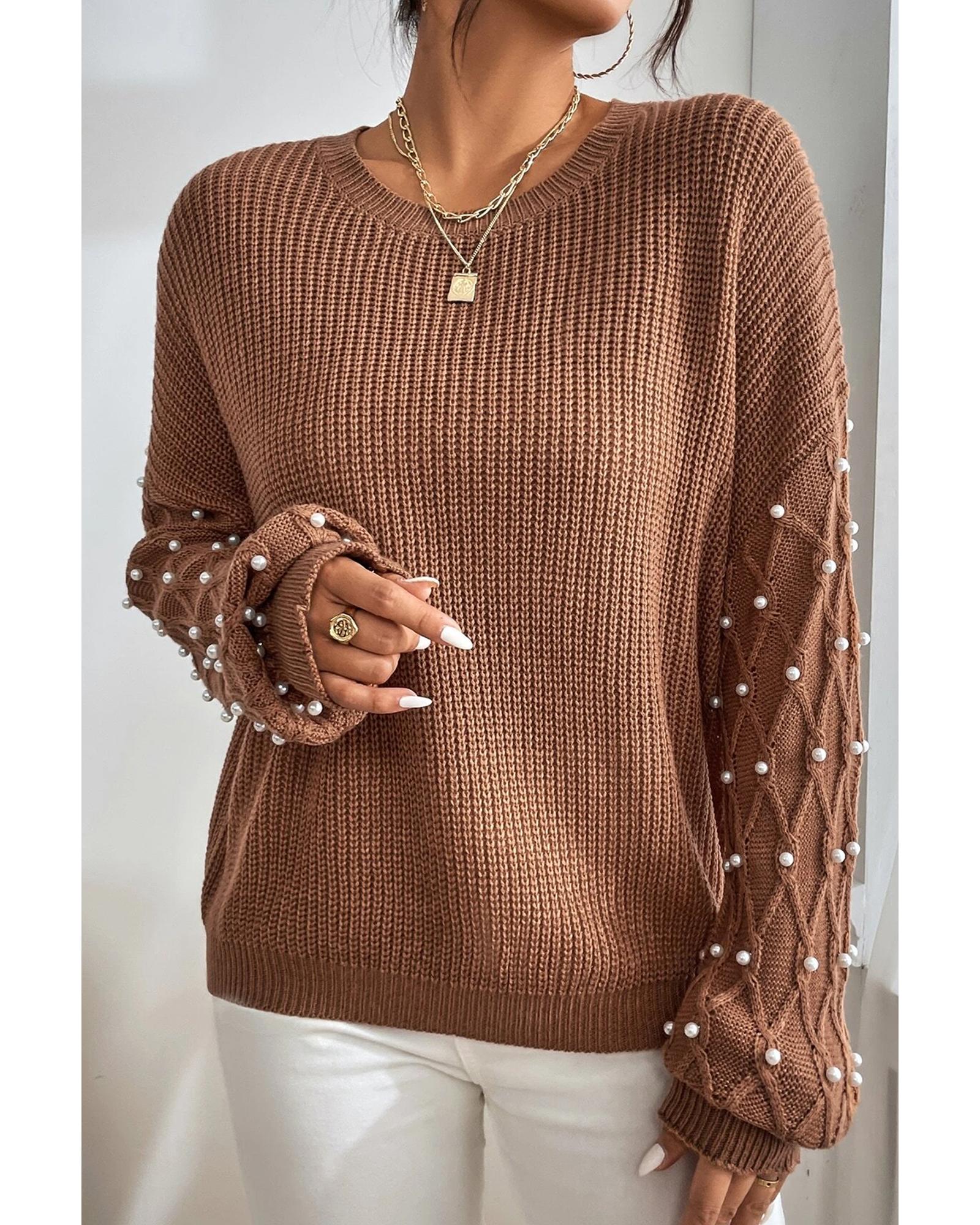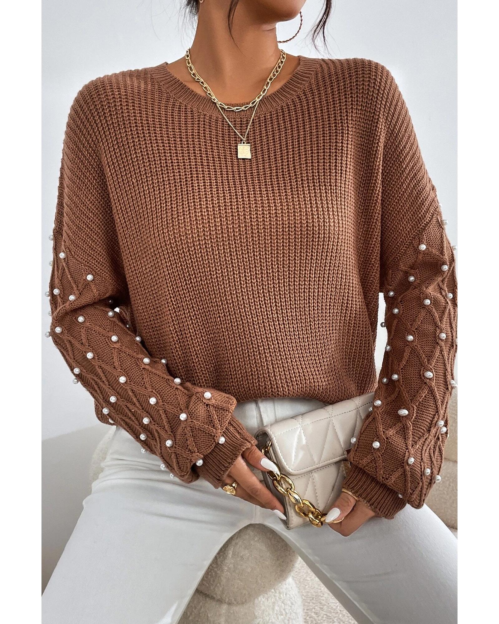 Chestnut Beaded Drop Shoulder Round Neck Sweater – S