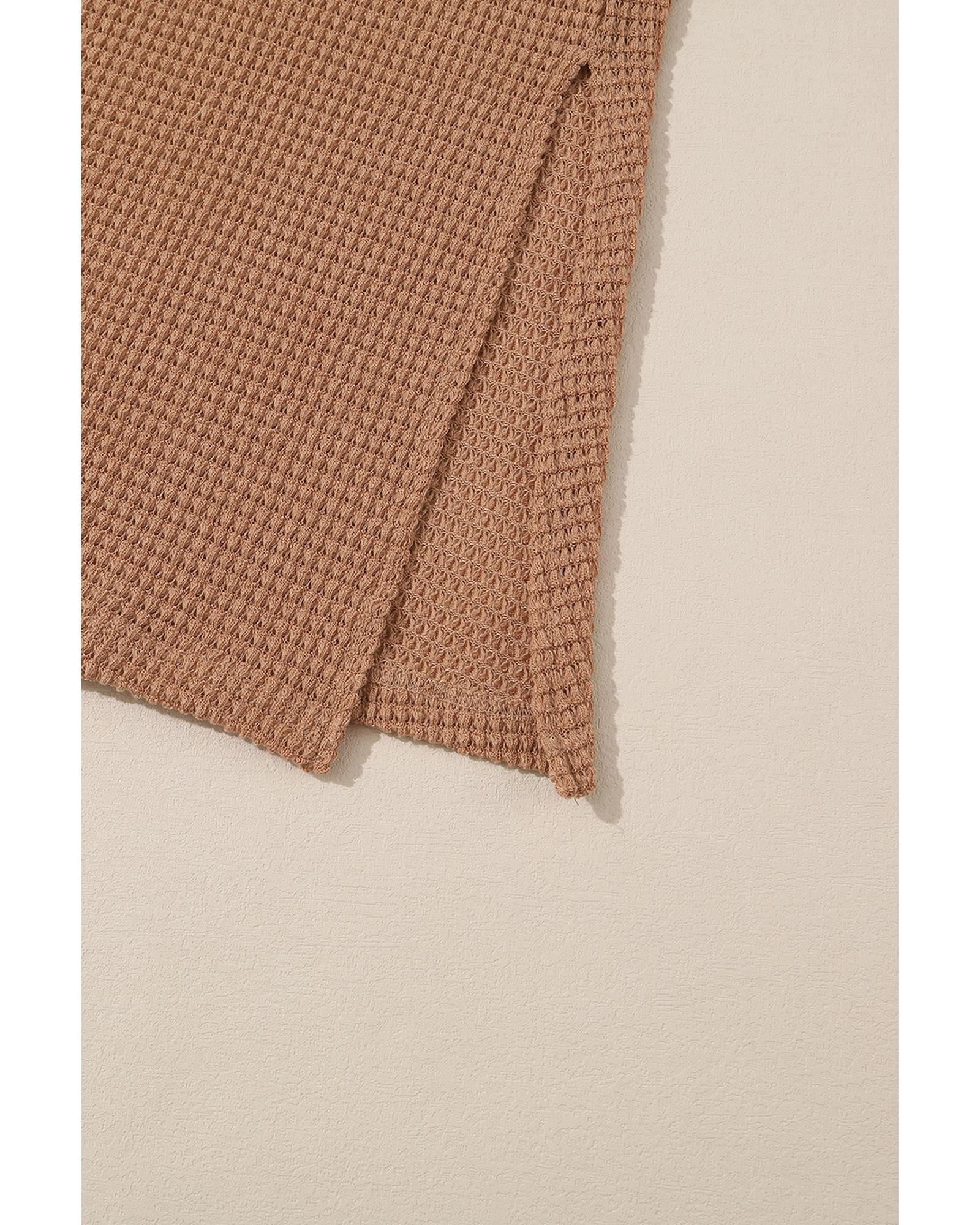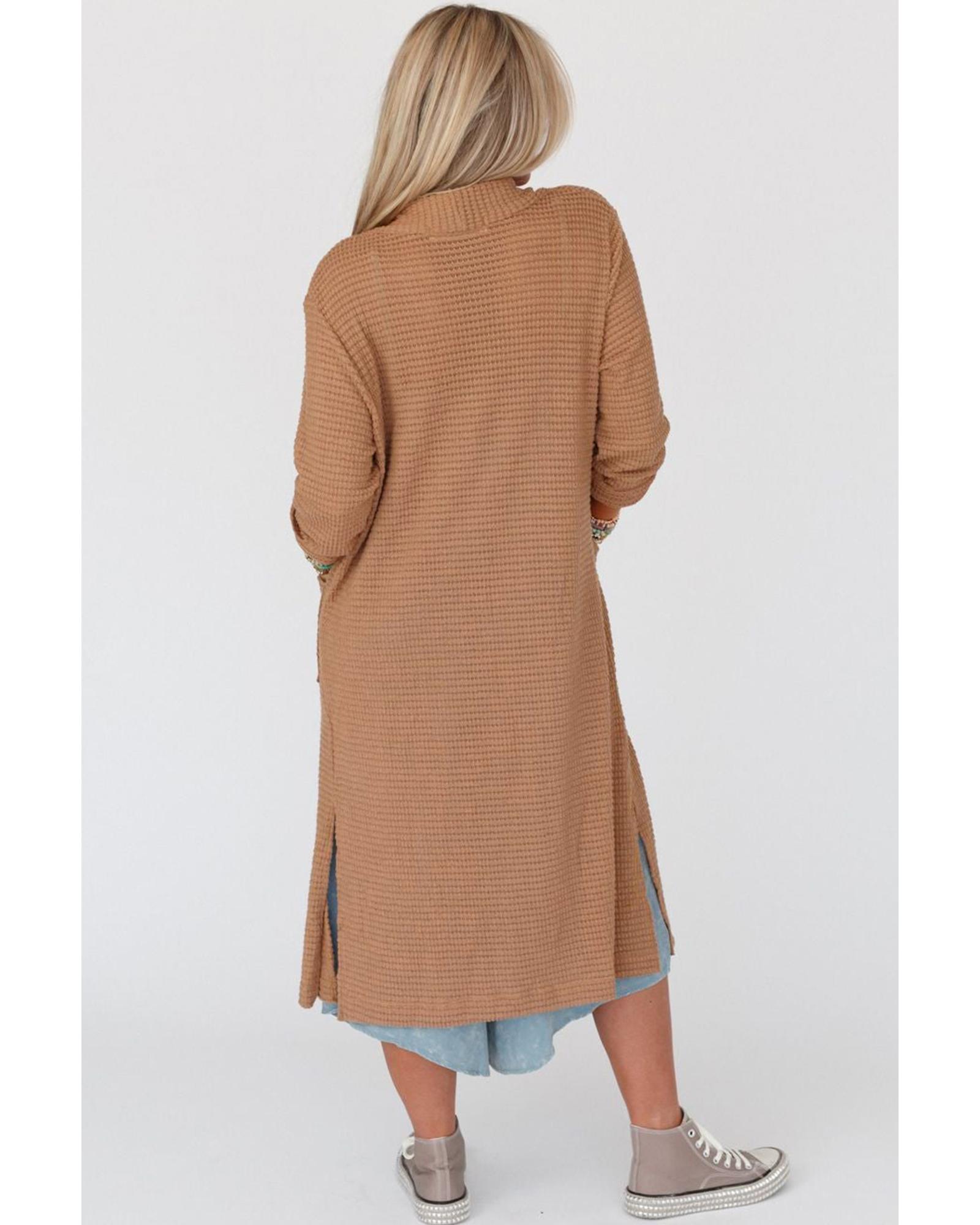This long waffle knit cardigan features a cozy and lightweight fabric, designed for a relaxed and stylish look. It offers a duster length with a classic open front, fitted long sleeves, and convenient patch pockets. Side slits add to its fashionable appearance and ease of movement.