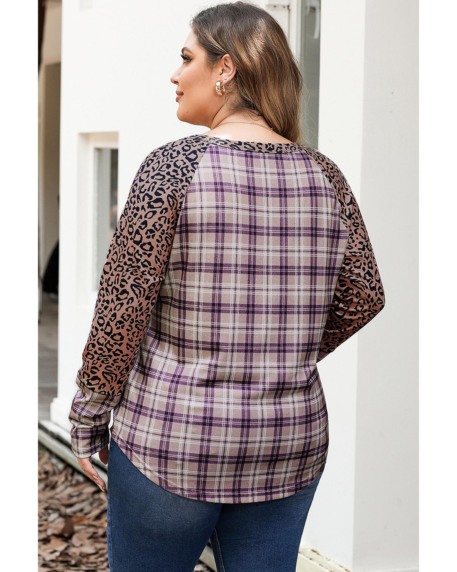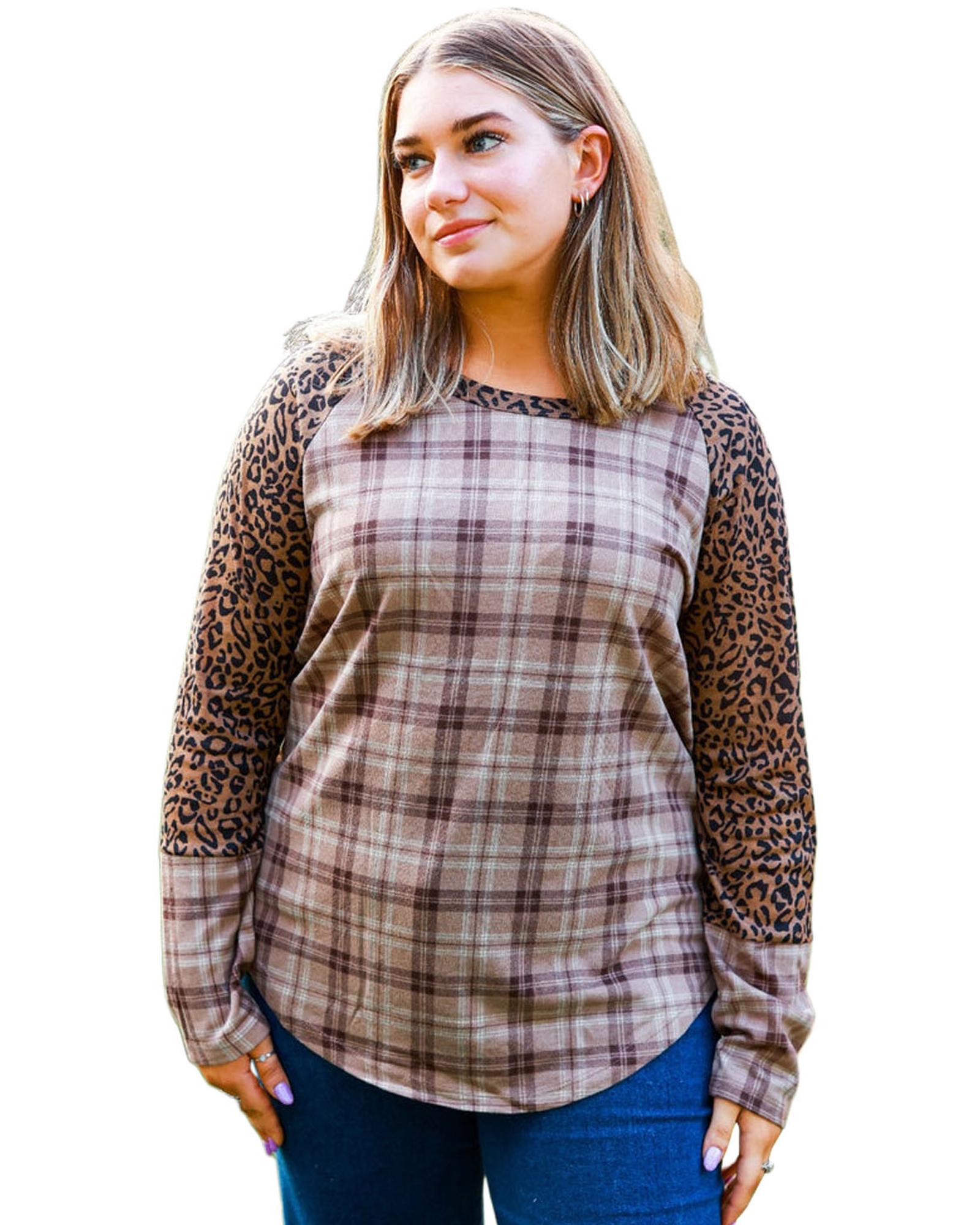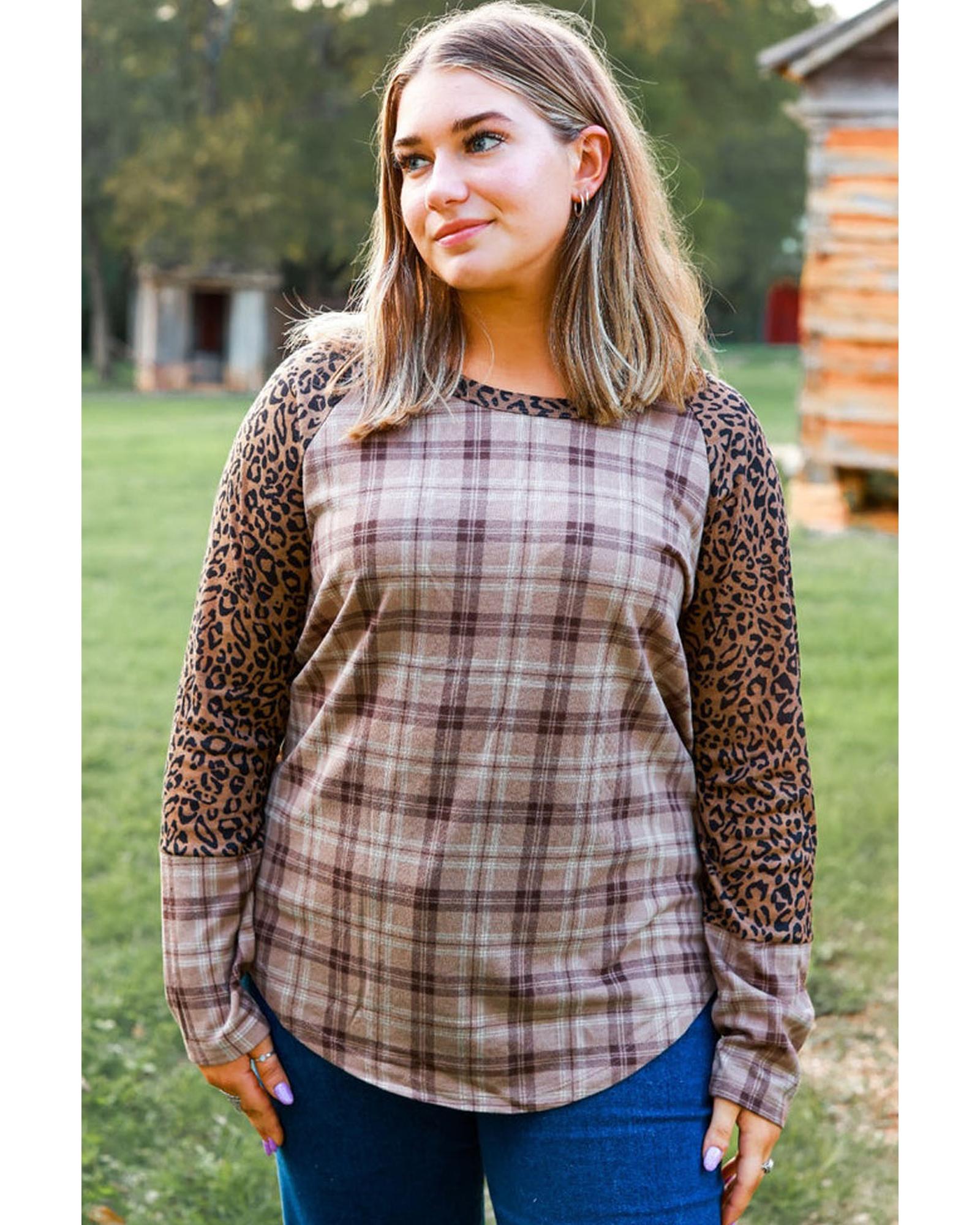 Chestnut Plus Size Leopard Raglan Sleeve Plaid Top – 1X