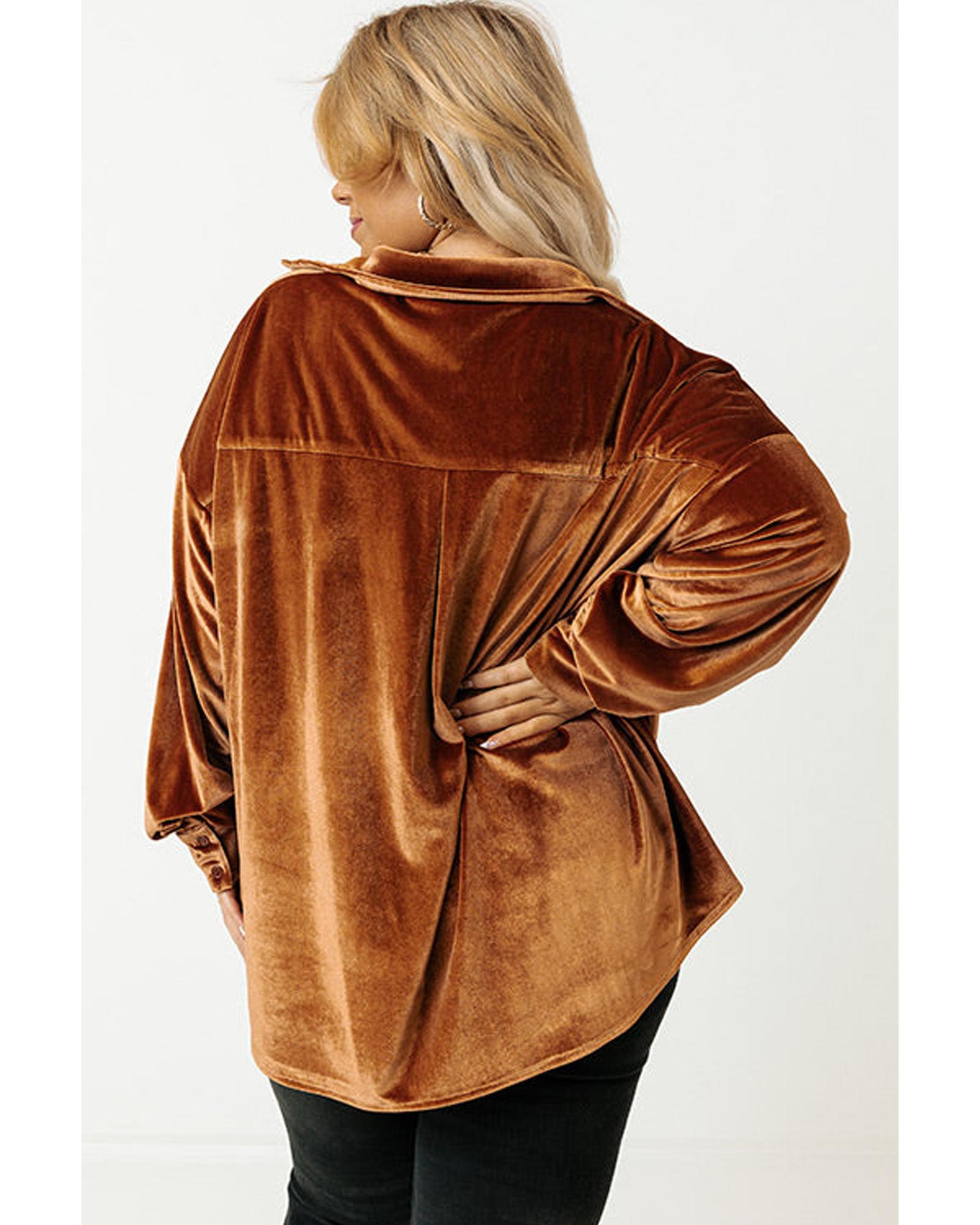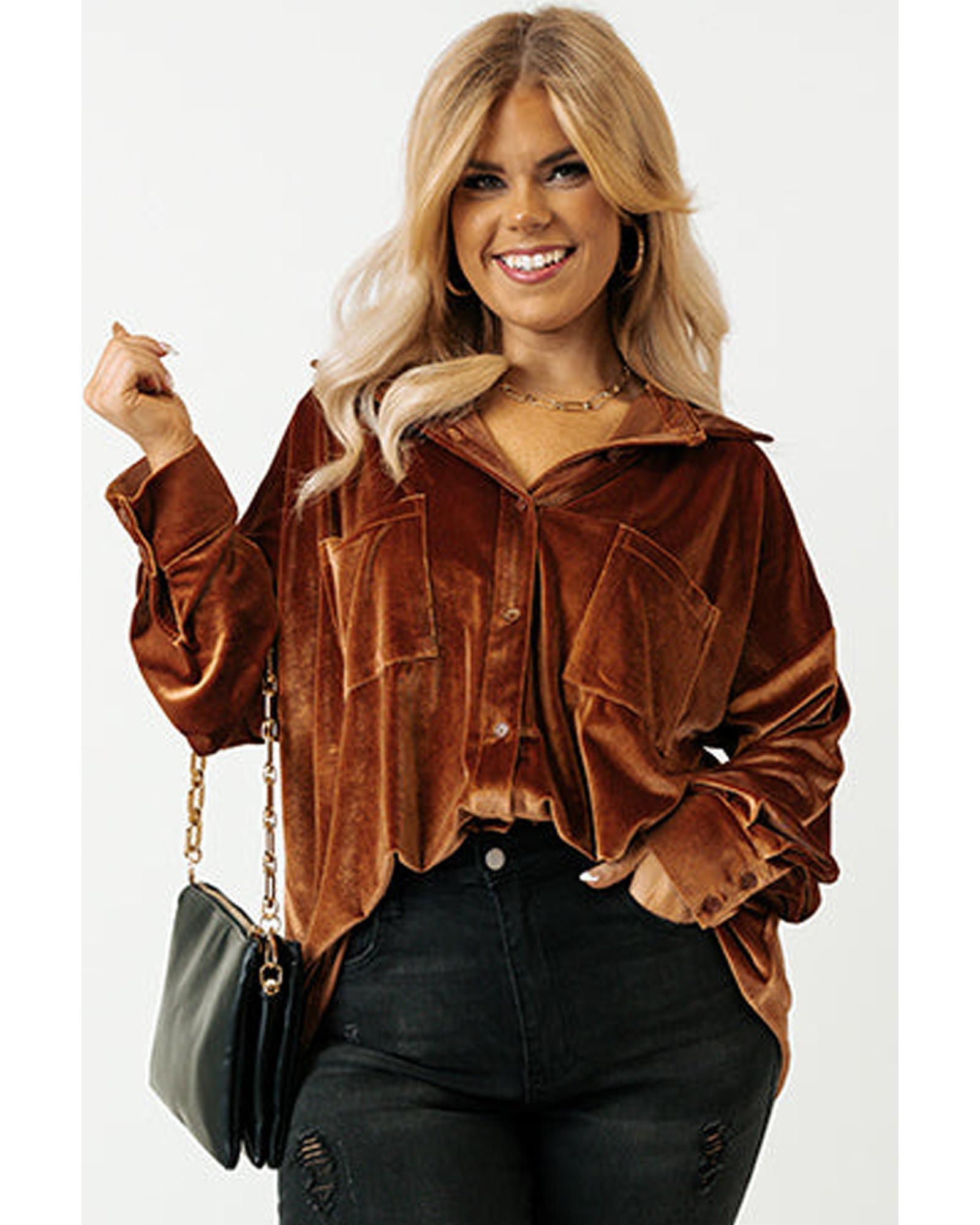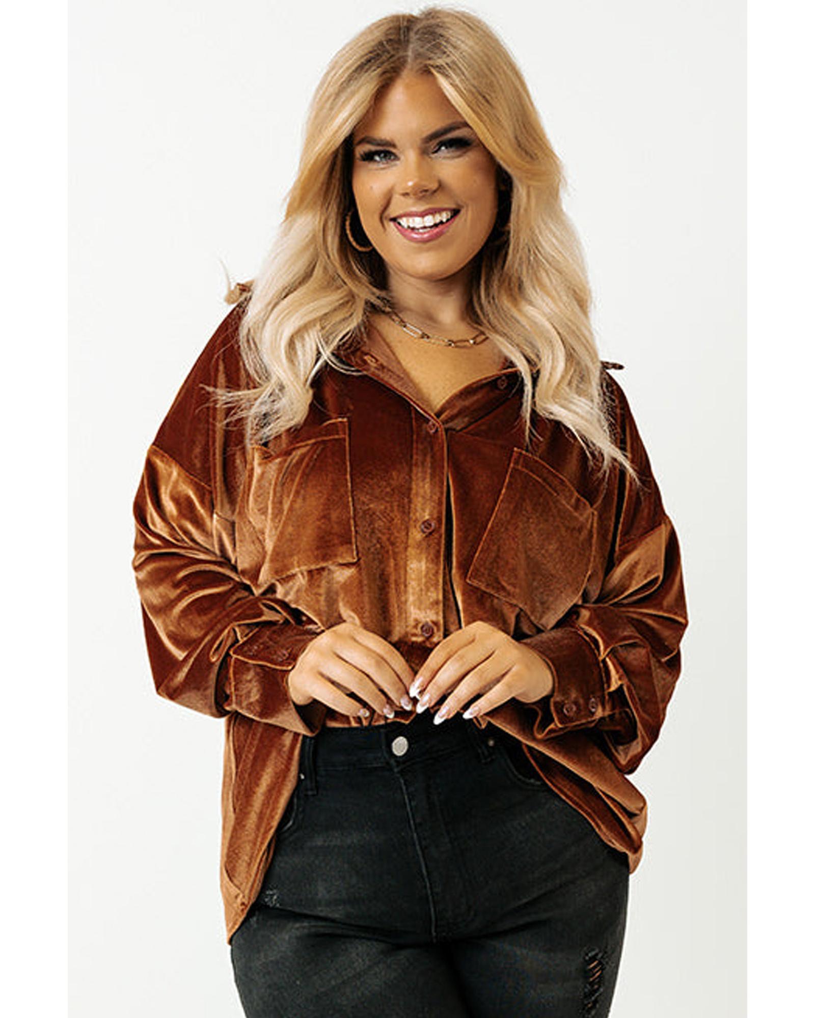 Chestnut Plus Size Velvet Chest Pocket Drop Shoulder Shirt – 1X