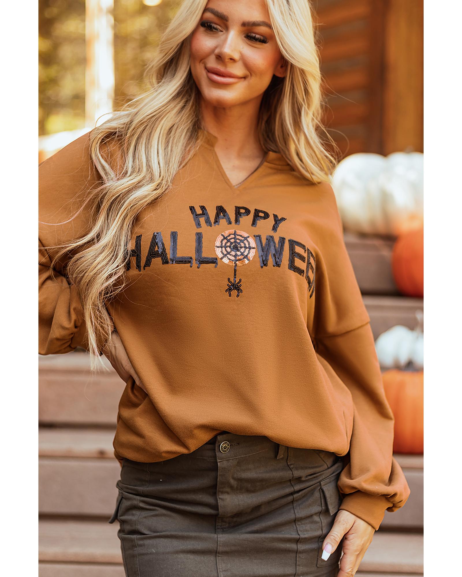 Chestnut Sequin Happy Halloween Graphic Notched Neck Long Sleeve Loose Top – L