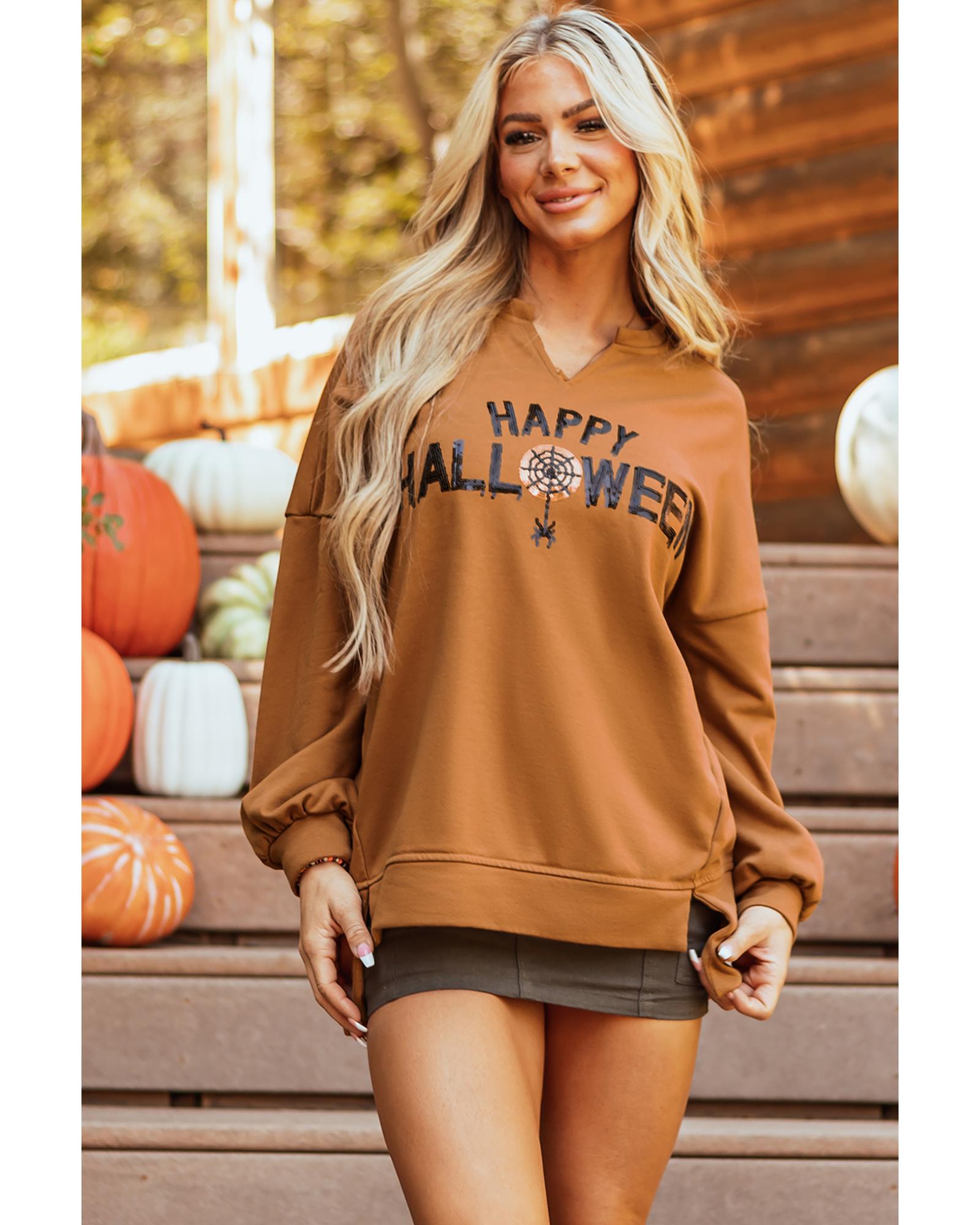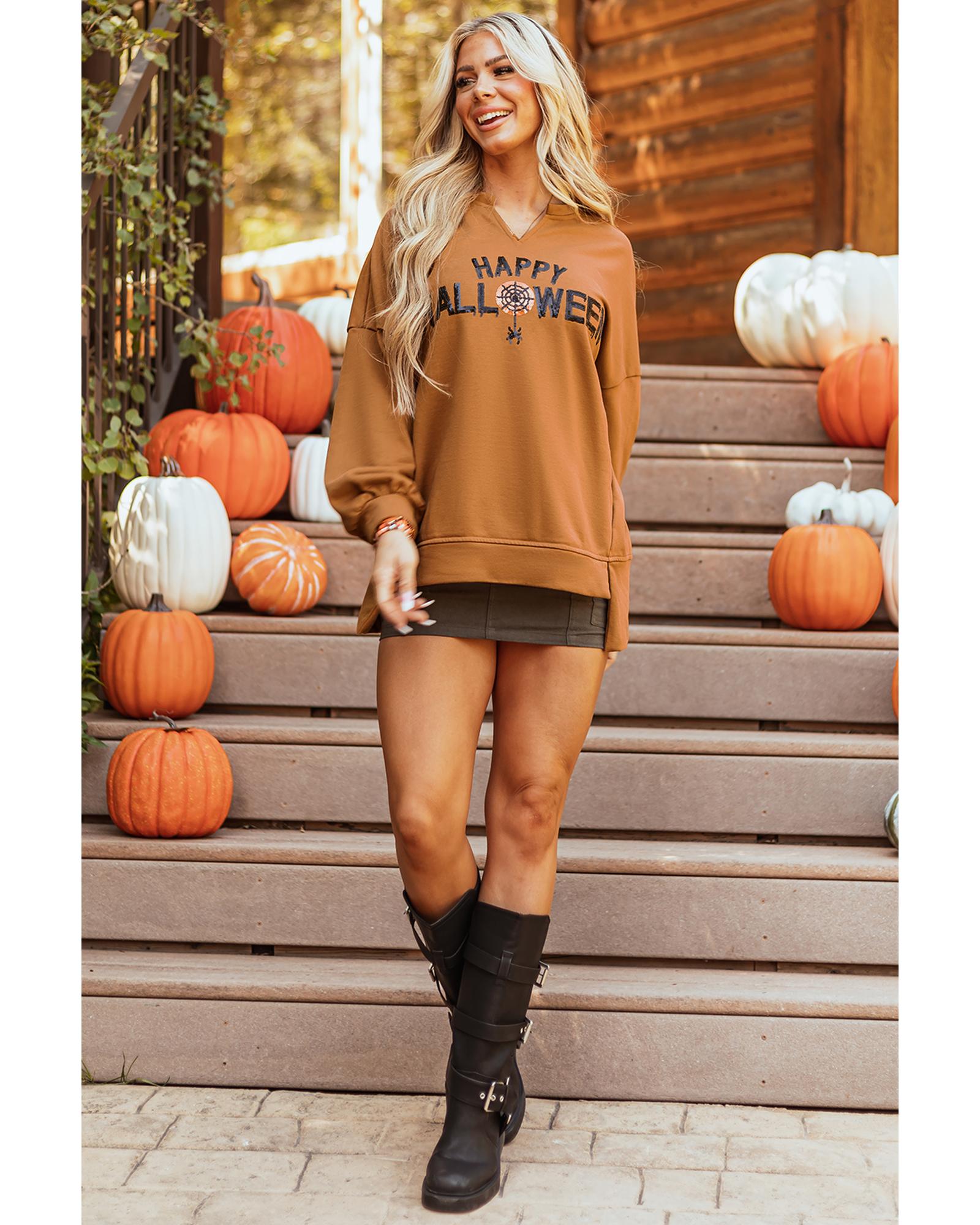 Chestnut Sequin Happy Halloween Graphic Notched Neck Long Sleeve Loose Top – XL