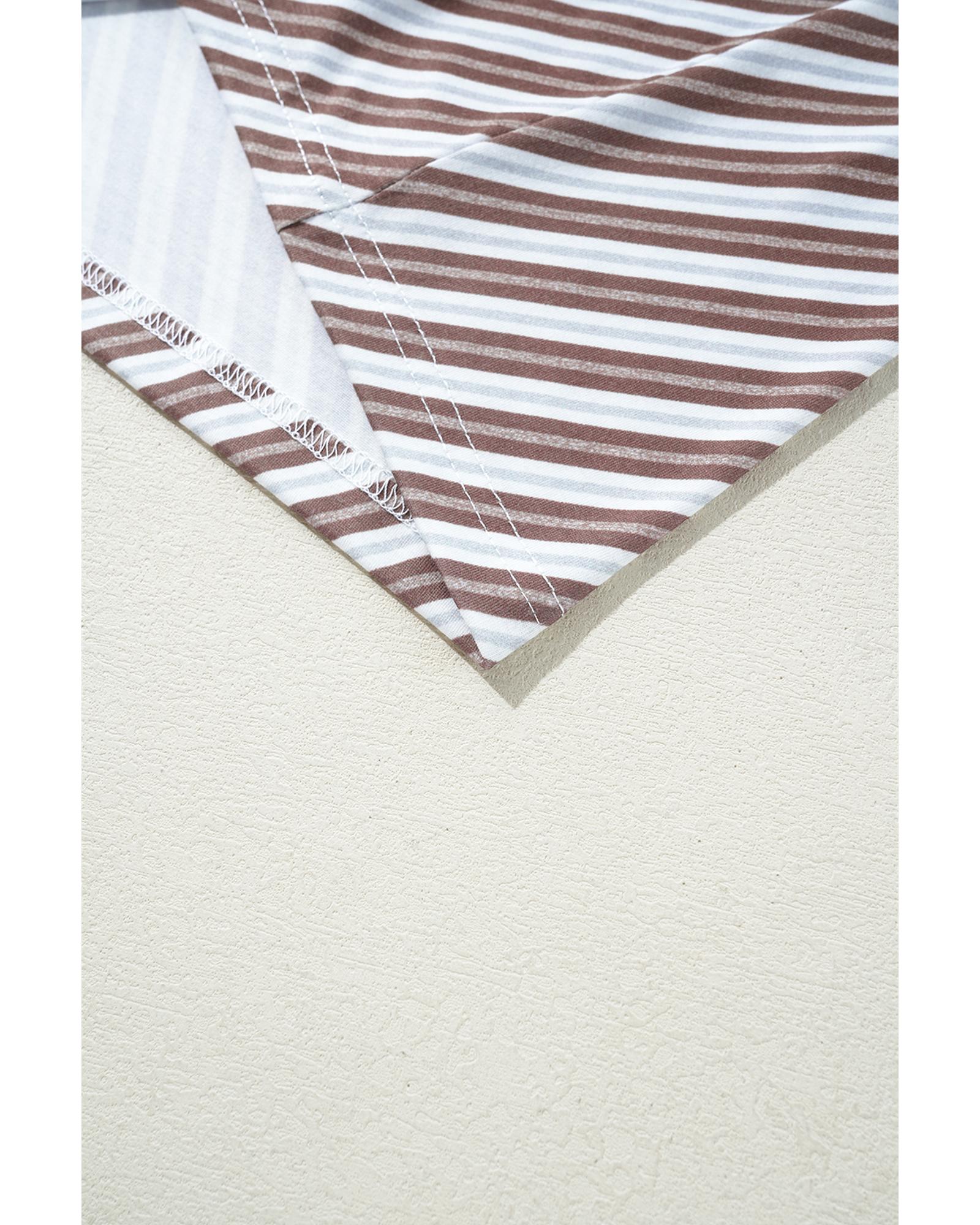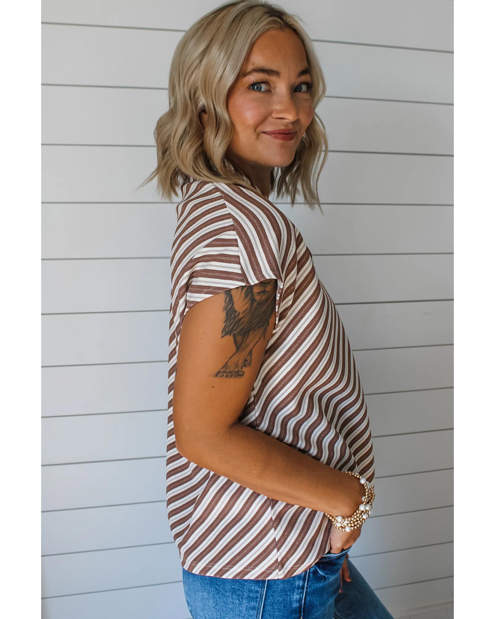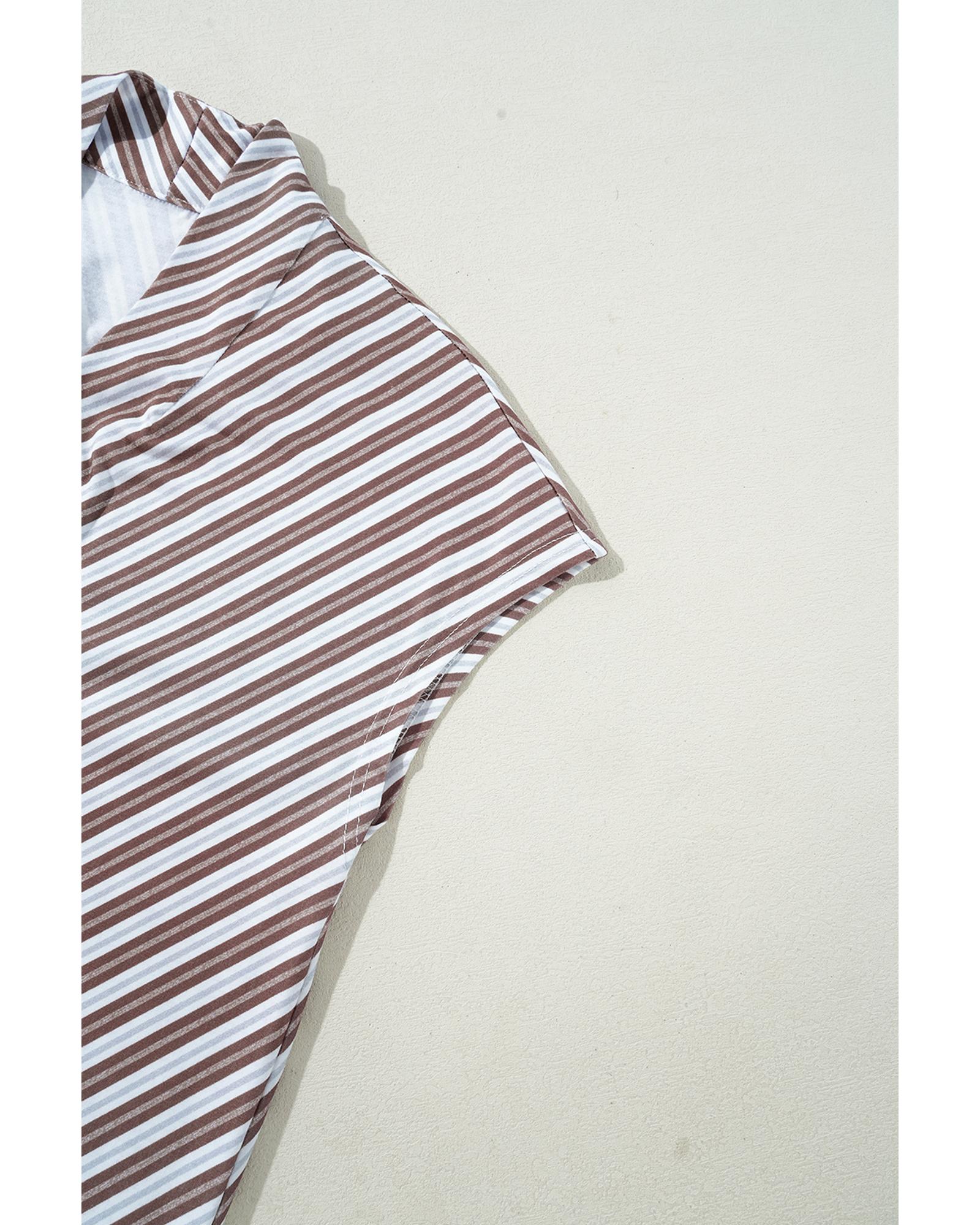 Chestnut Striped Stand V Neck Short Sleeve Blouse – L