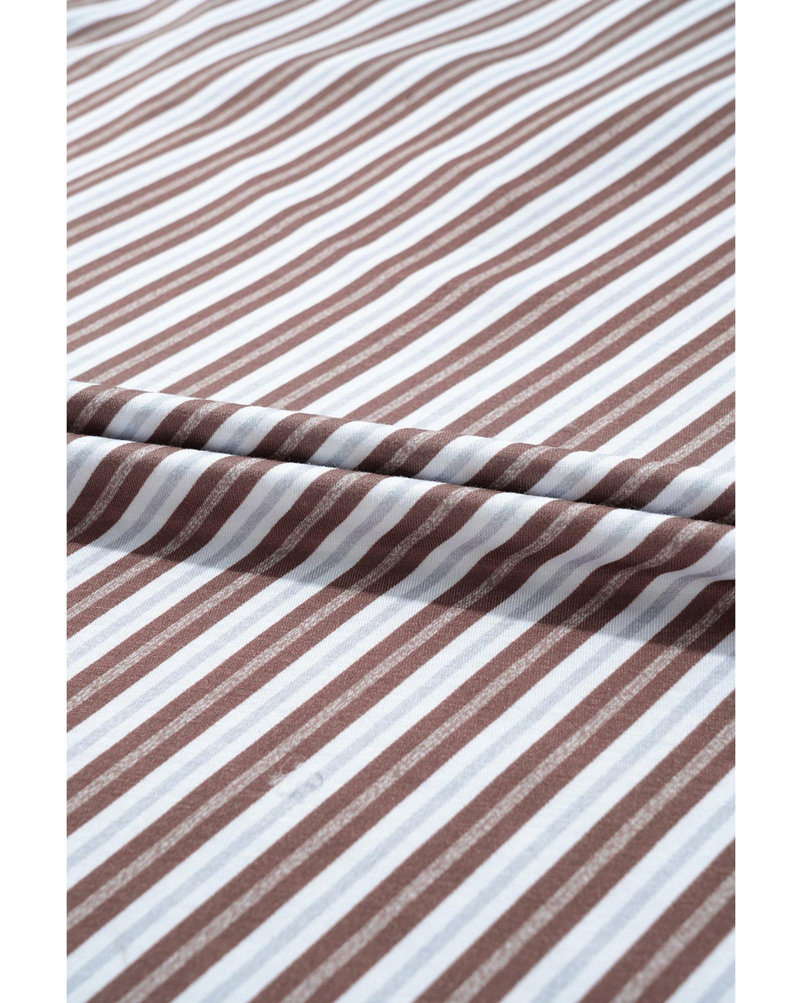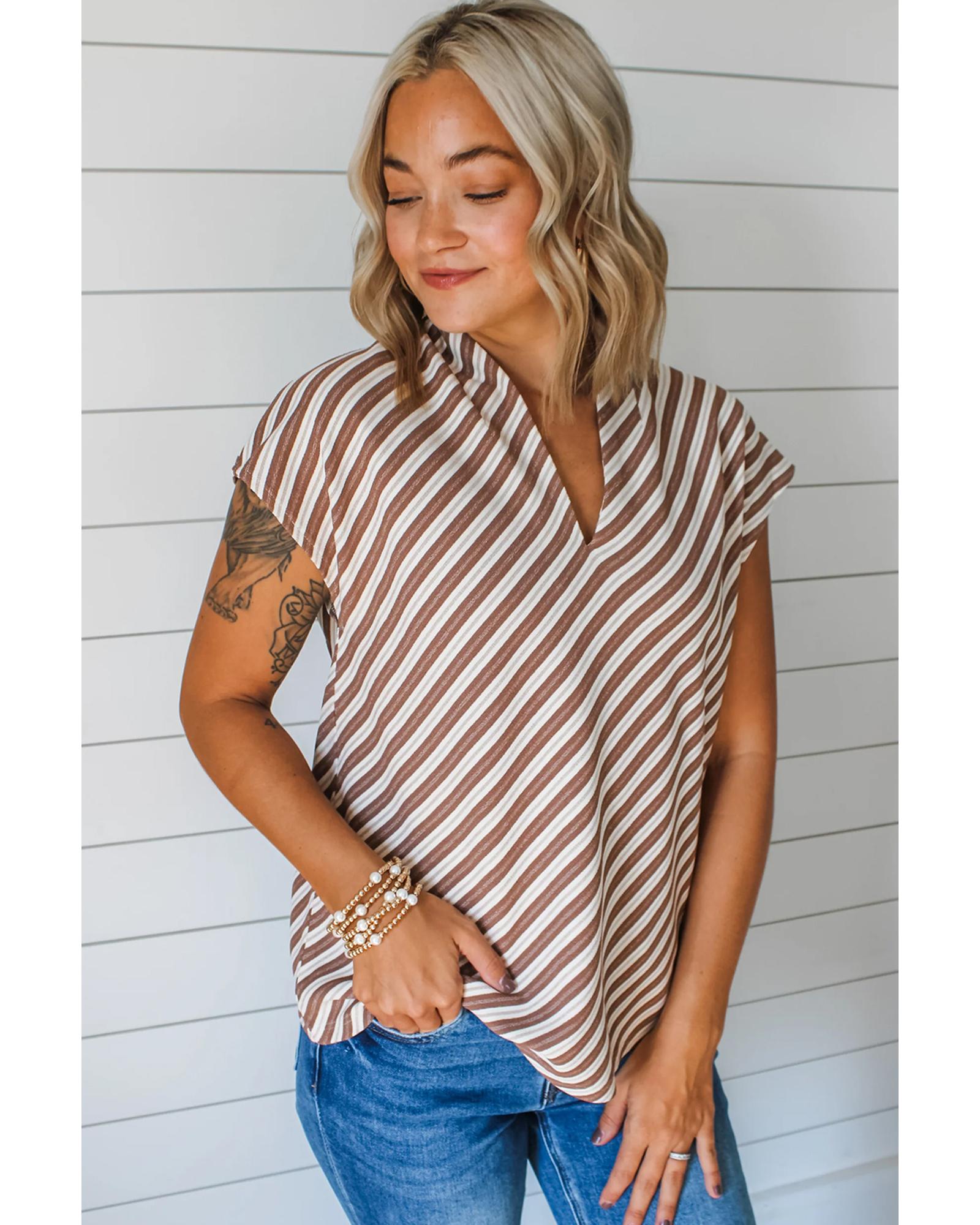 This chestnut striped stand V neck short sleeve blouse offers a stylish and elegant look suitable for various occasions. Its classic design features a structured neckline and short sleeves, providing a timeless silhouette. The vibrant striped pattern adds a dynamic touch to your wardrobe.