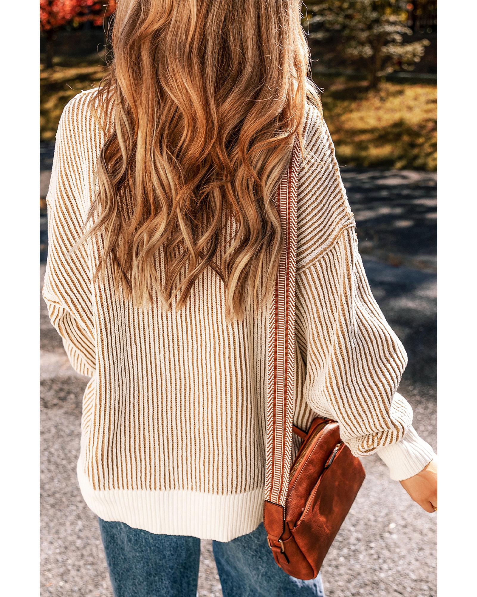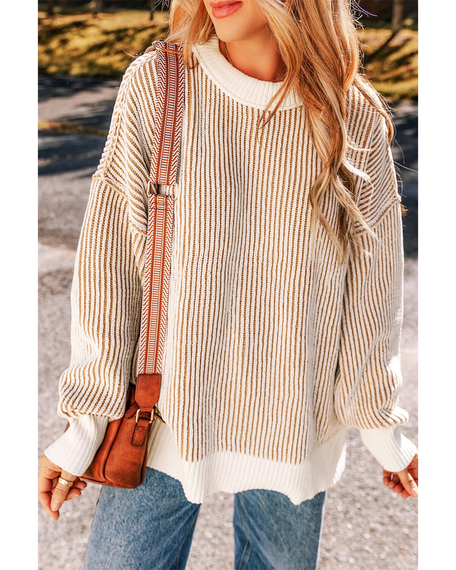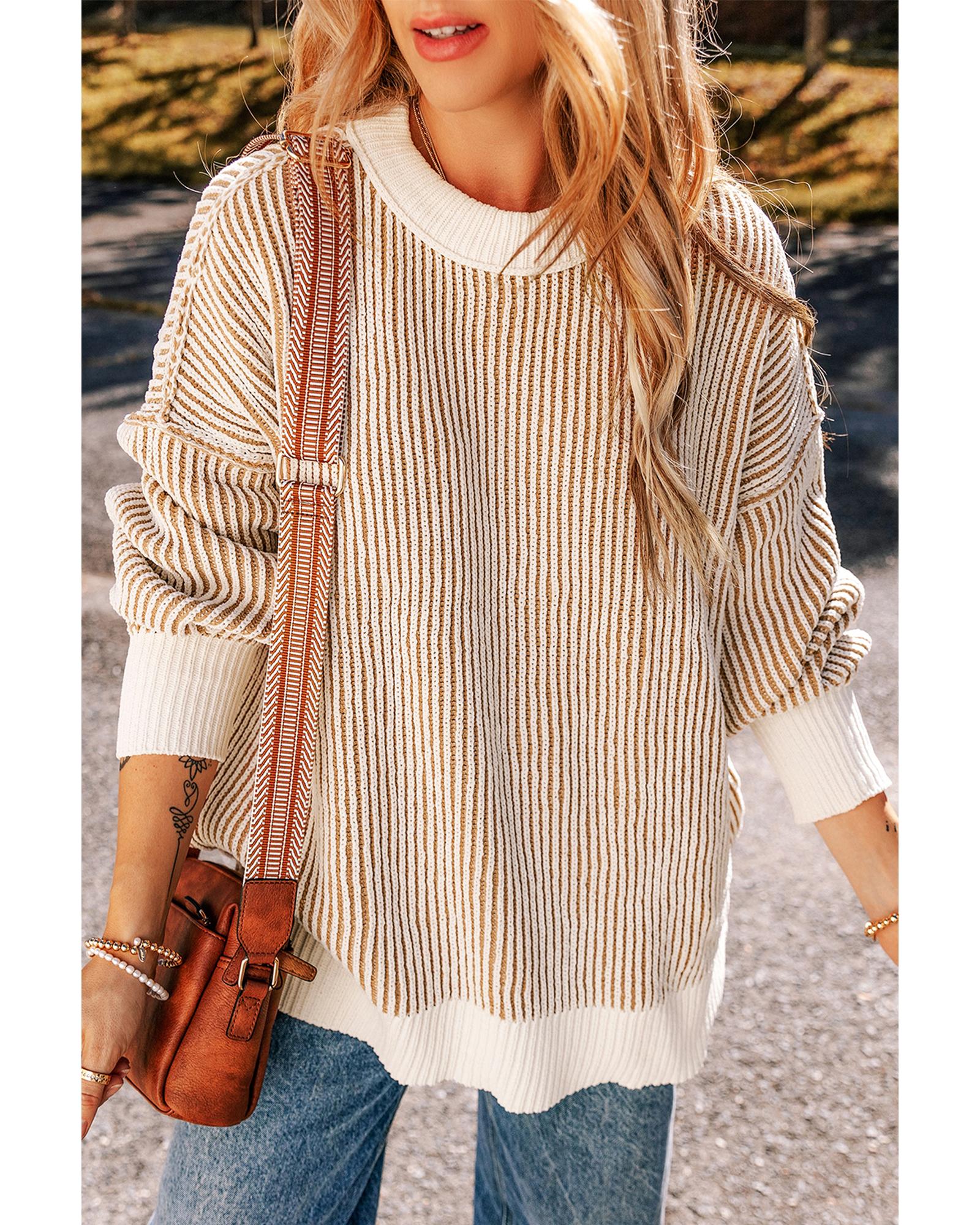 This loose sweater features a stylish striped design with textured knit fabric and contrast edge detailing, offering a trendy and modern look. Its relaxed fit provides comfort and ease of movement, making it suitable for various casual occasions. Available in multiple sizes, it is designed to elevate any outfit effortlessly.