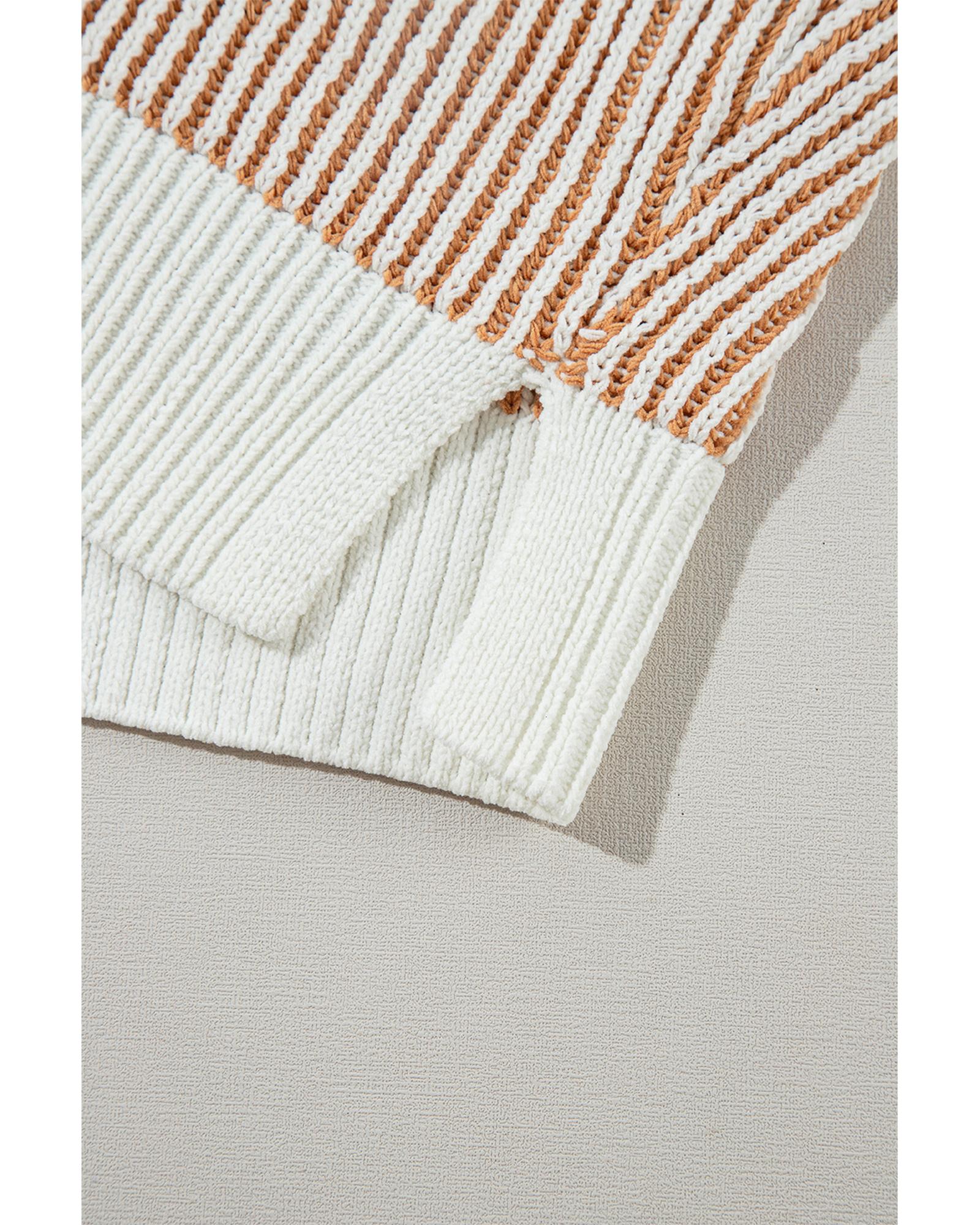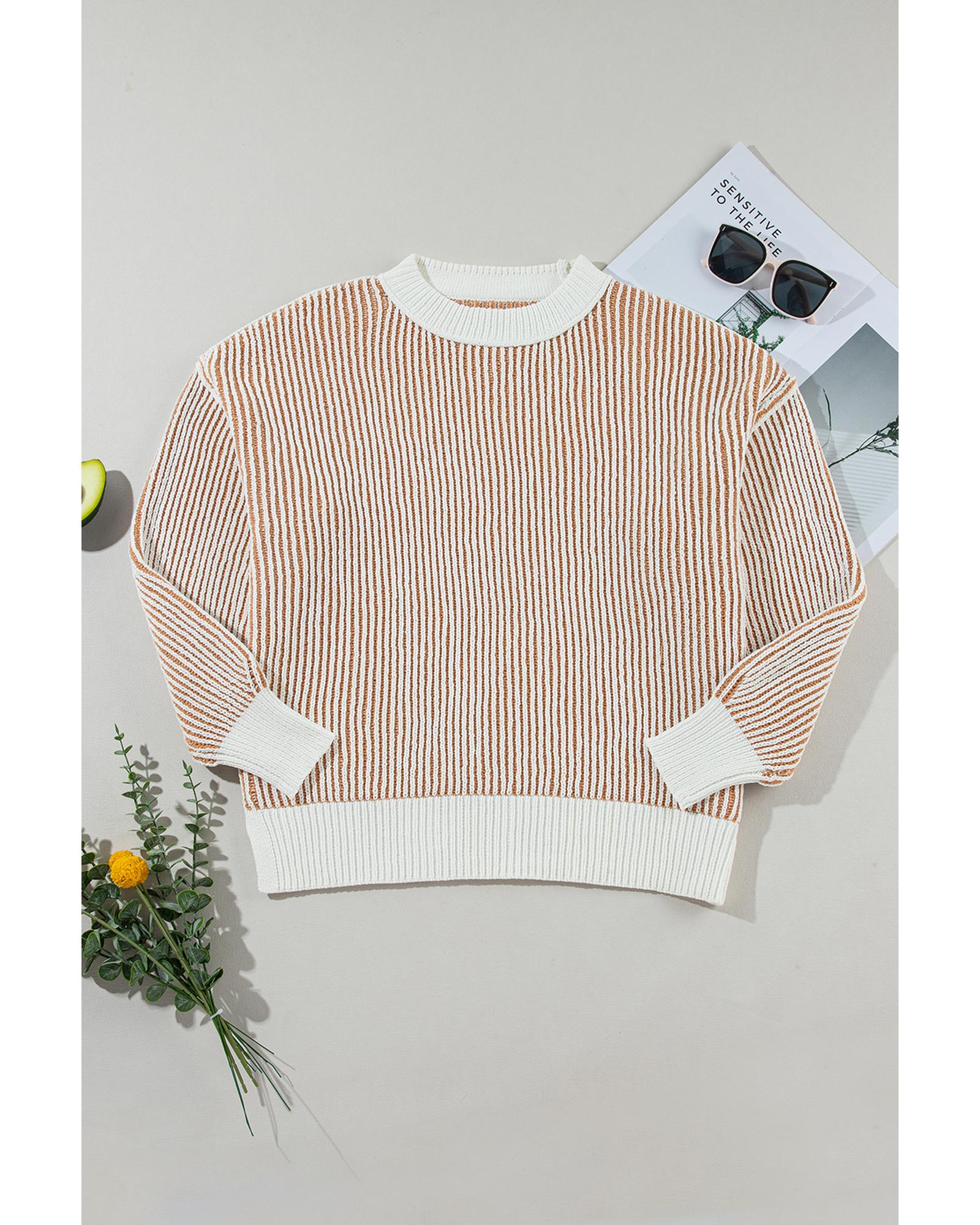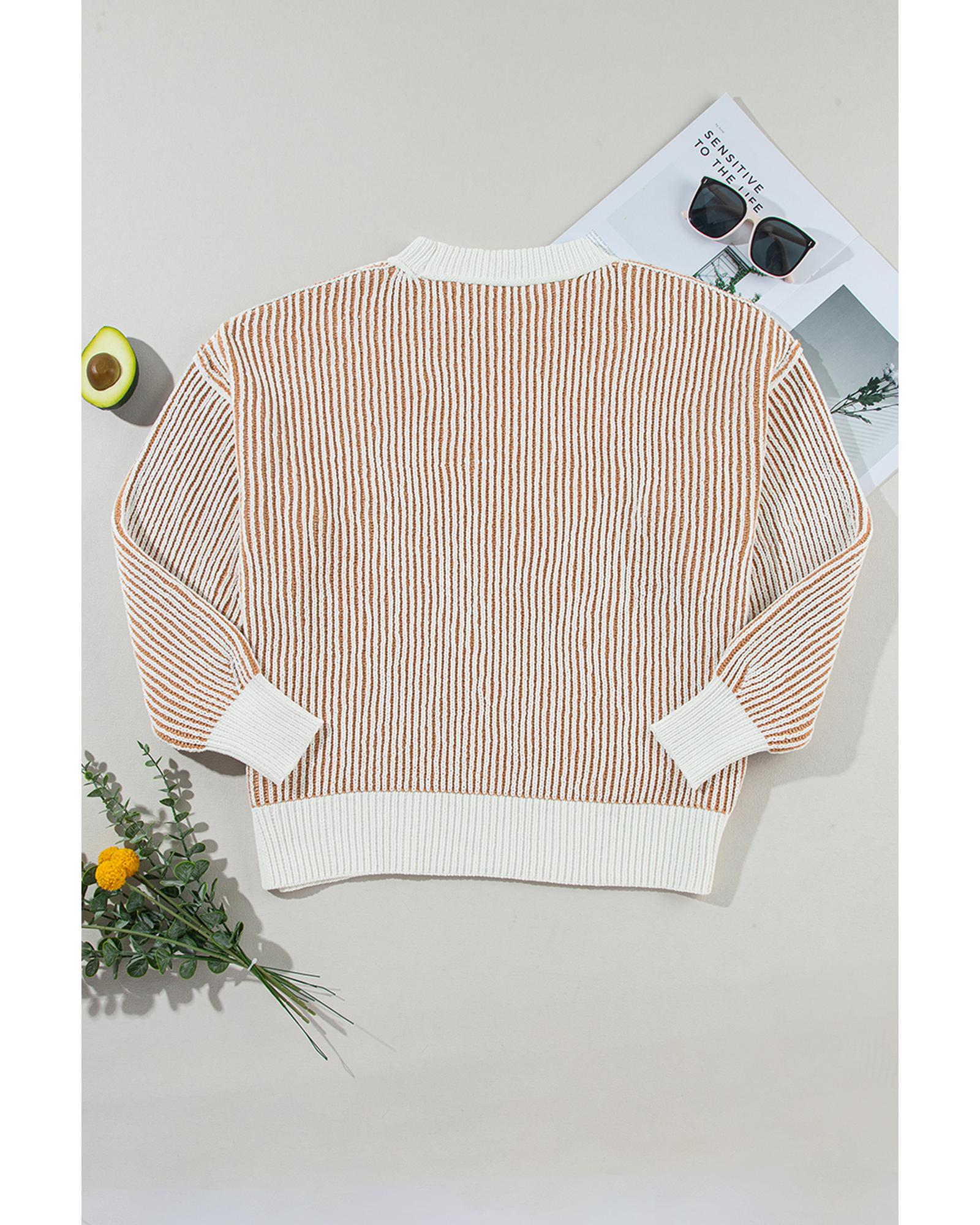Chestnut Striped Textured Knit Contrast Edge Loose Sweater – XL