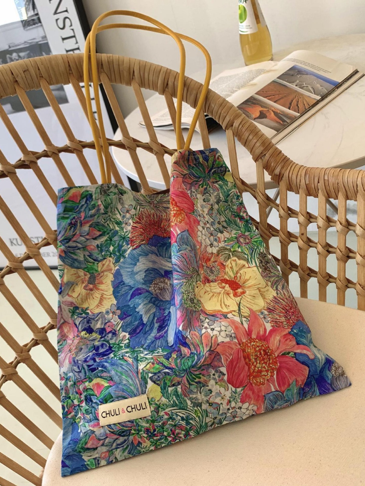 This canvas tote bag features a vibrant floral design, making it a stylish and practical accessory for everyday use. Its durable construction and versatile size make it suitable for shopping, casual outings, or daily errands.