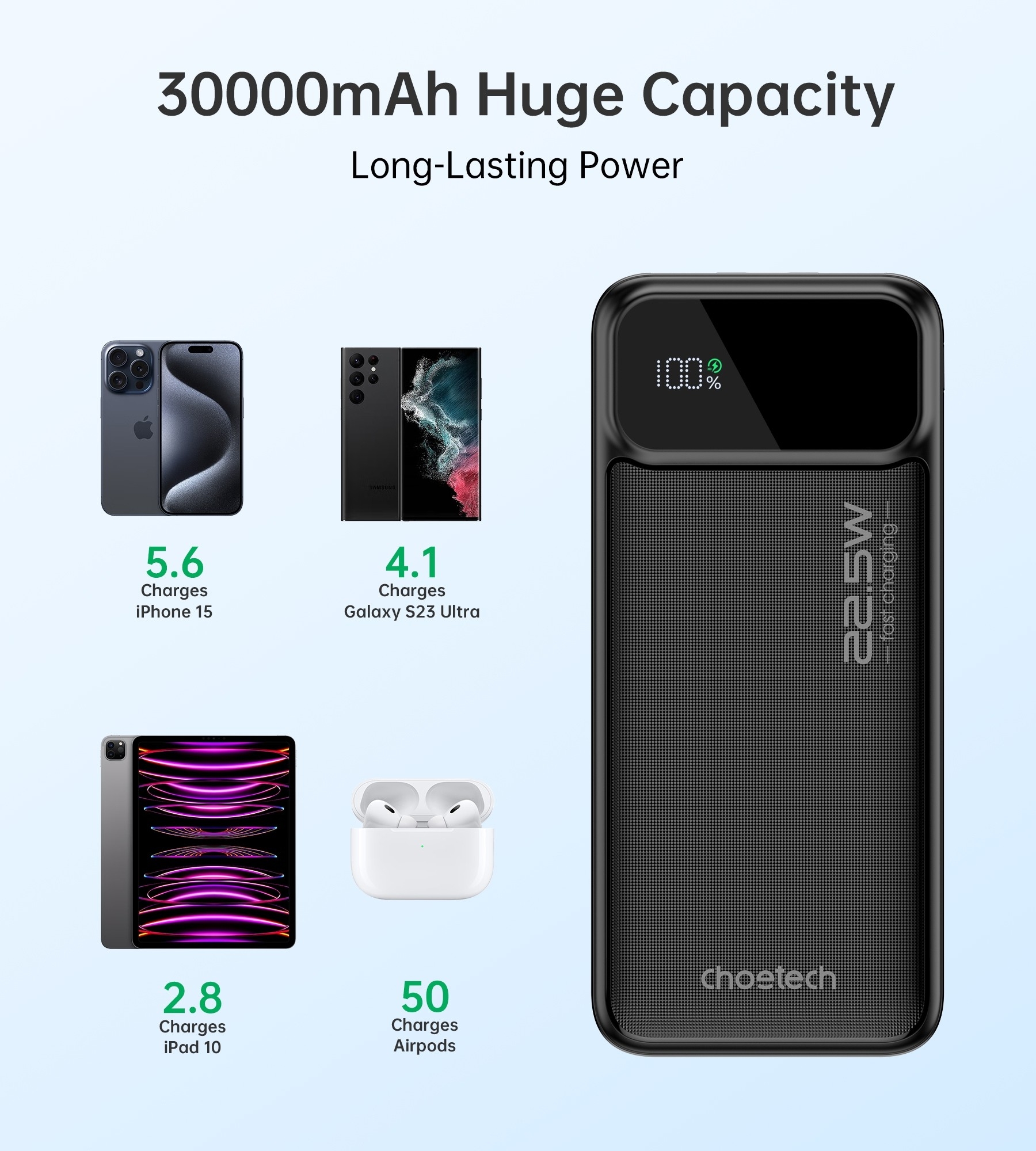 CHOETECH B730 30000mAh Power Bank PD22.5W with Digital Display