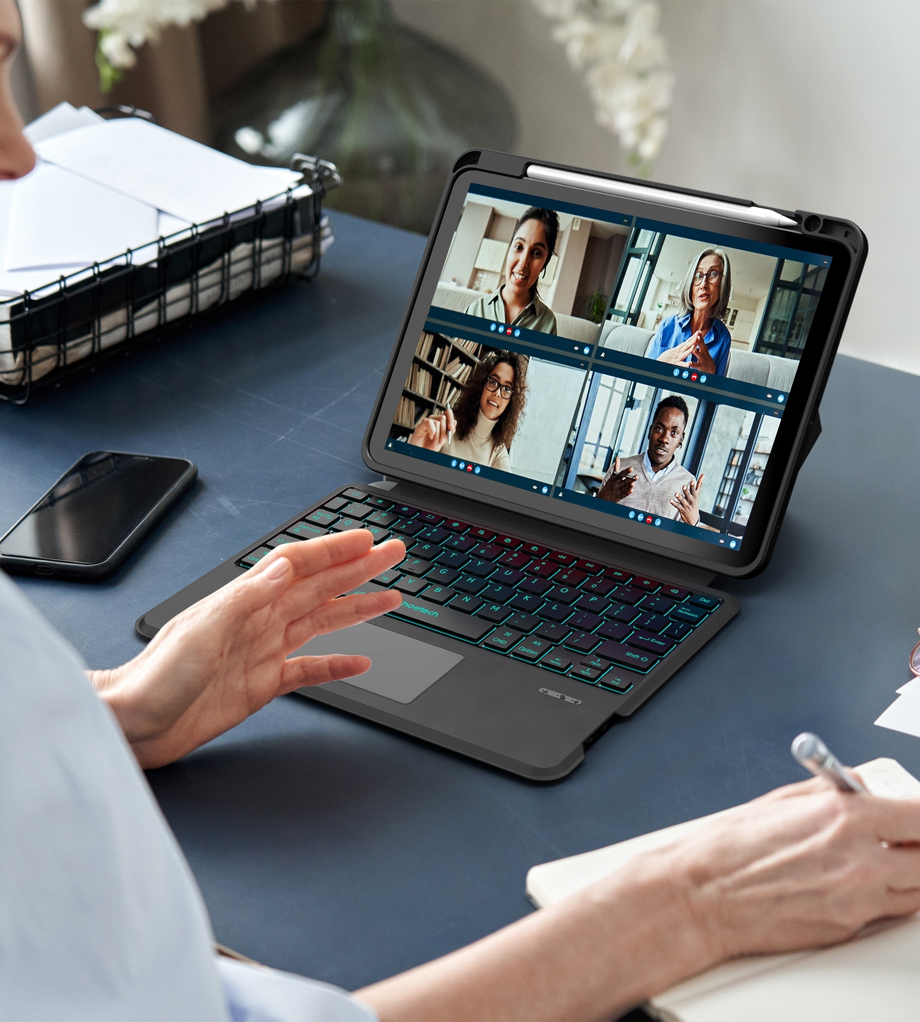 This wireless keyboard is specially designed for the iPad Pro 11 inch, offering a combination of protection, functionality, and convenience. It features a touchpad with multi-finger support and backlight, a built-in stand for hands-free use, and a holder for the Apple Pencil, making it ideal for productivity and entertainment on the go.